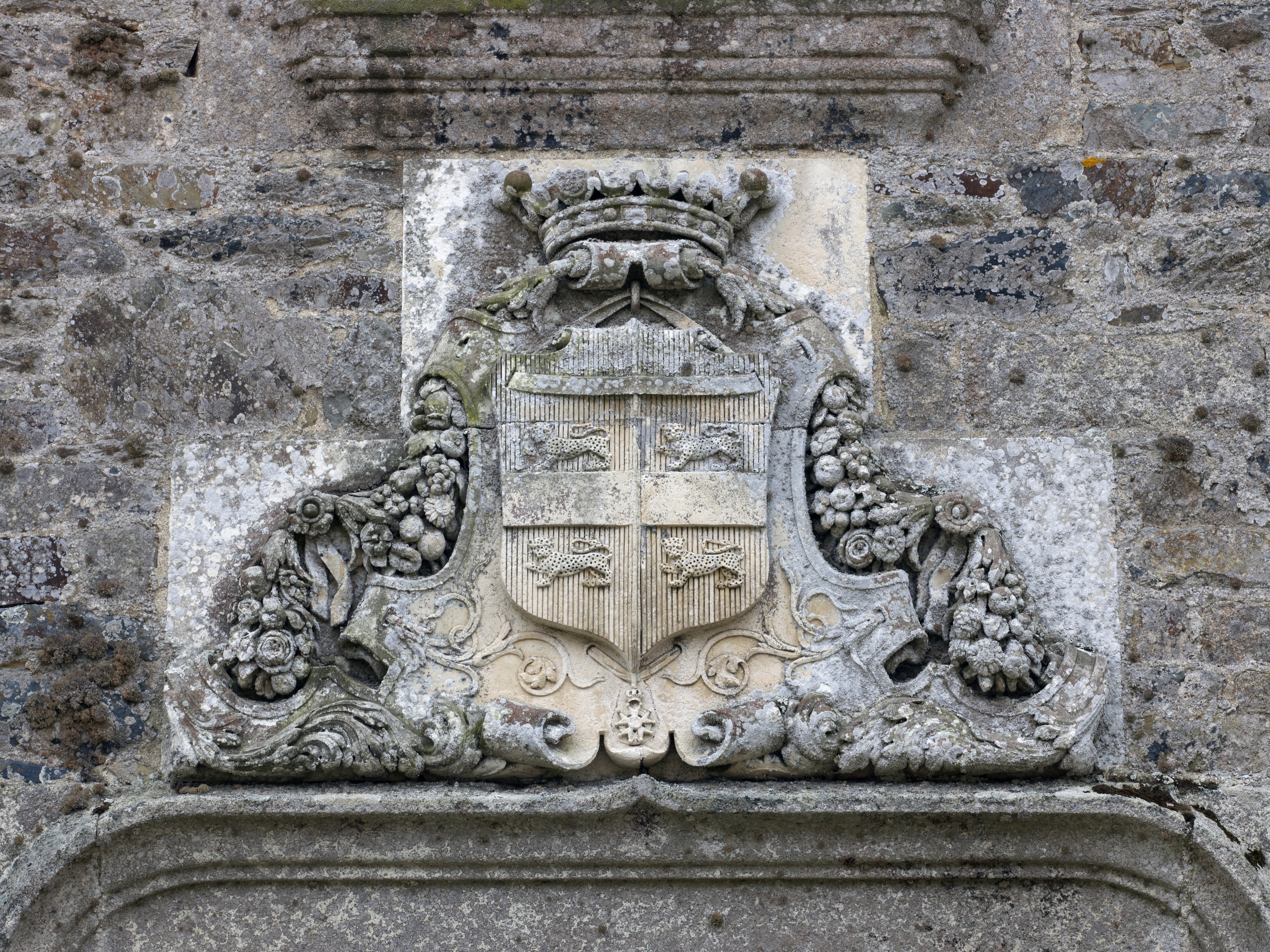 Façade principale. Détail du blason au-dessus de la porte d'entrée : "De gueules à la face d'argent accompagnée de deux léopards d'or"Immatriculation