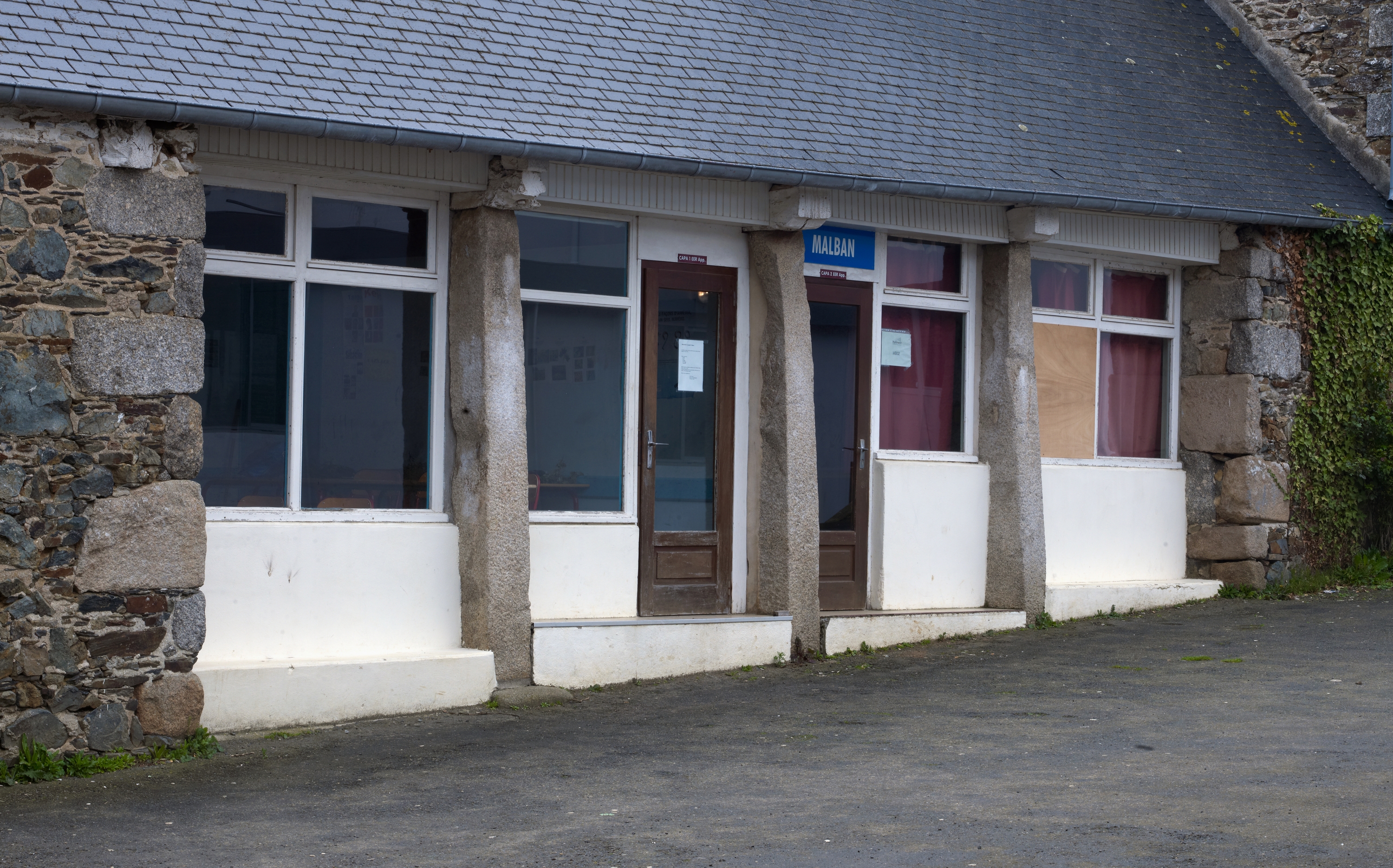 Remise agricole au nord-est du château. Détail du mur ouvert soutenu par trois piles monolithesImmatriculation