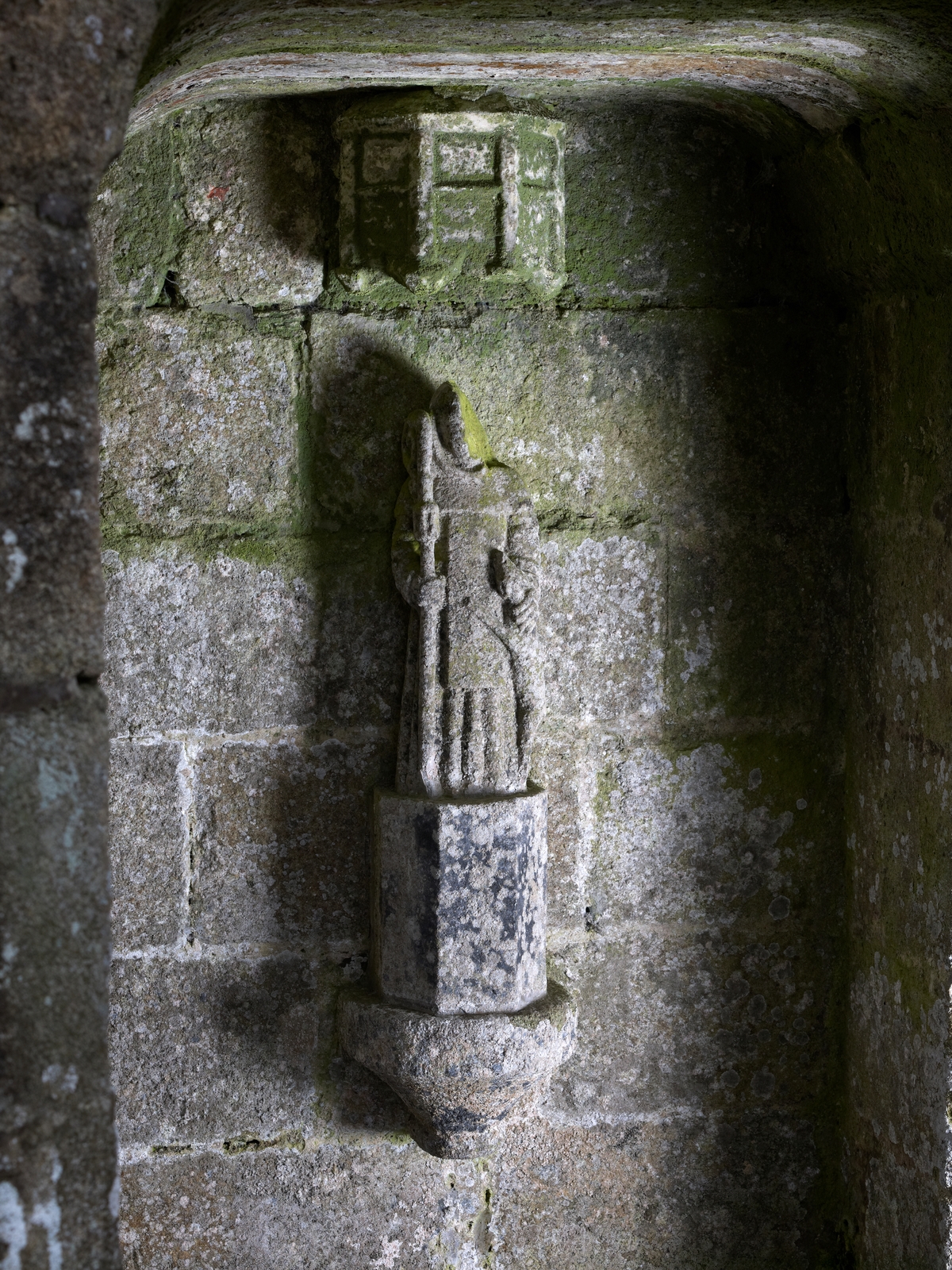 Plouzélambre : fontaine de dévotion dédiée à saint Sylvestre, détail de la statue. La tête est malheureusement briséeImmatriculation
