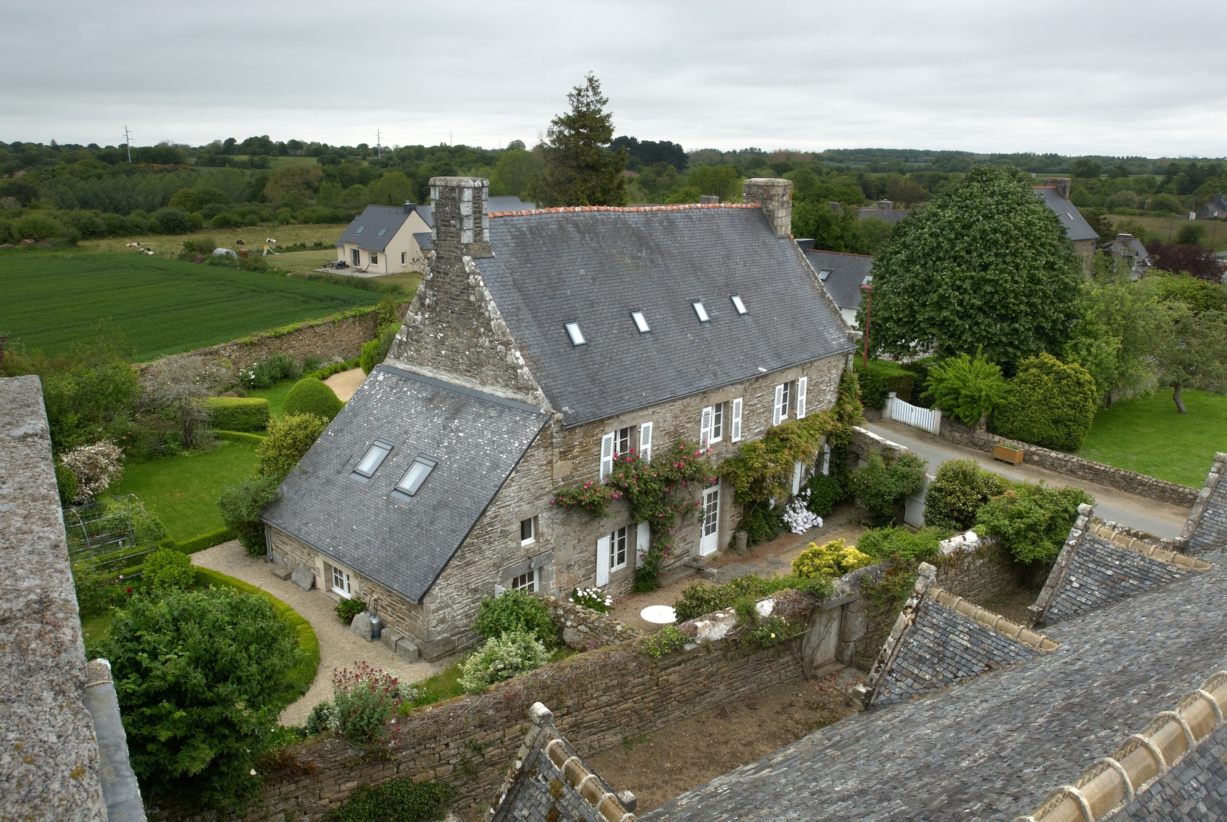 Plouzélambre, le bourg : presbytère, vue générale depuis le clocher de l'église paroissialeImmatriculation