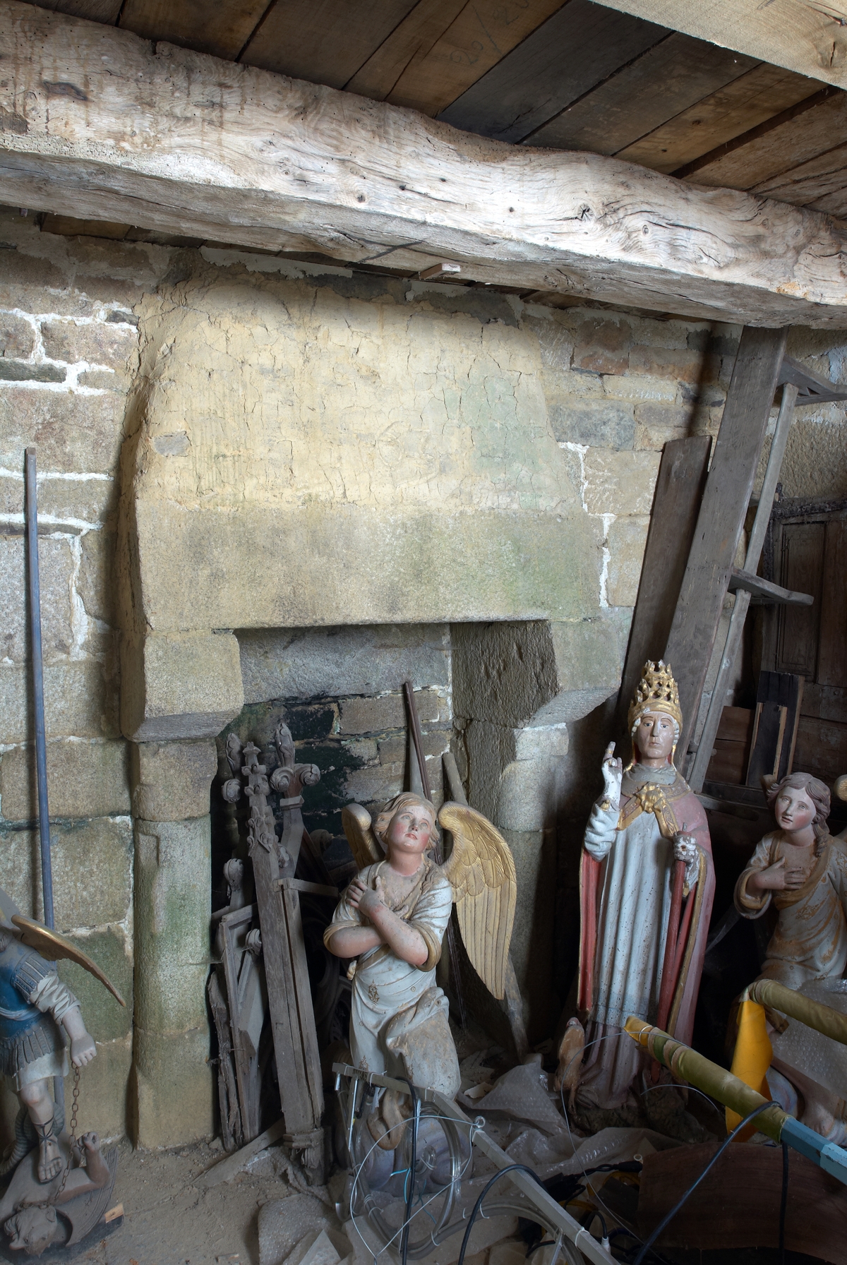 Plouzélambre, le bourg, enclos paroissial : église Saint-Sylvestre, porche monumentale sud, secrétairerie située à l'étage, détail de la cheminée. Du mobilier de l'église est entreposé dans cette pièceImmatriculation