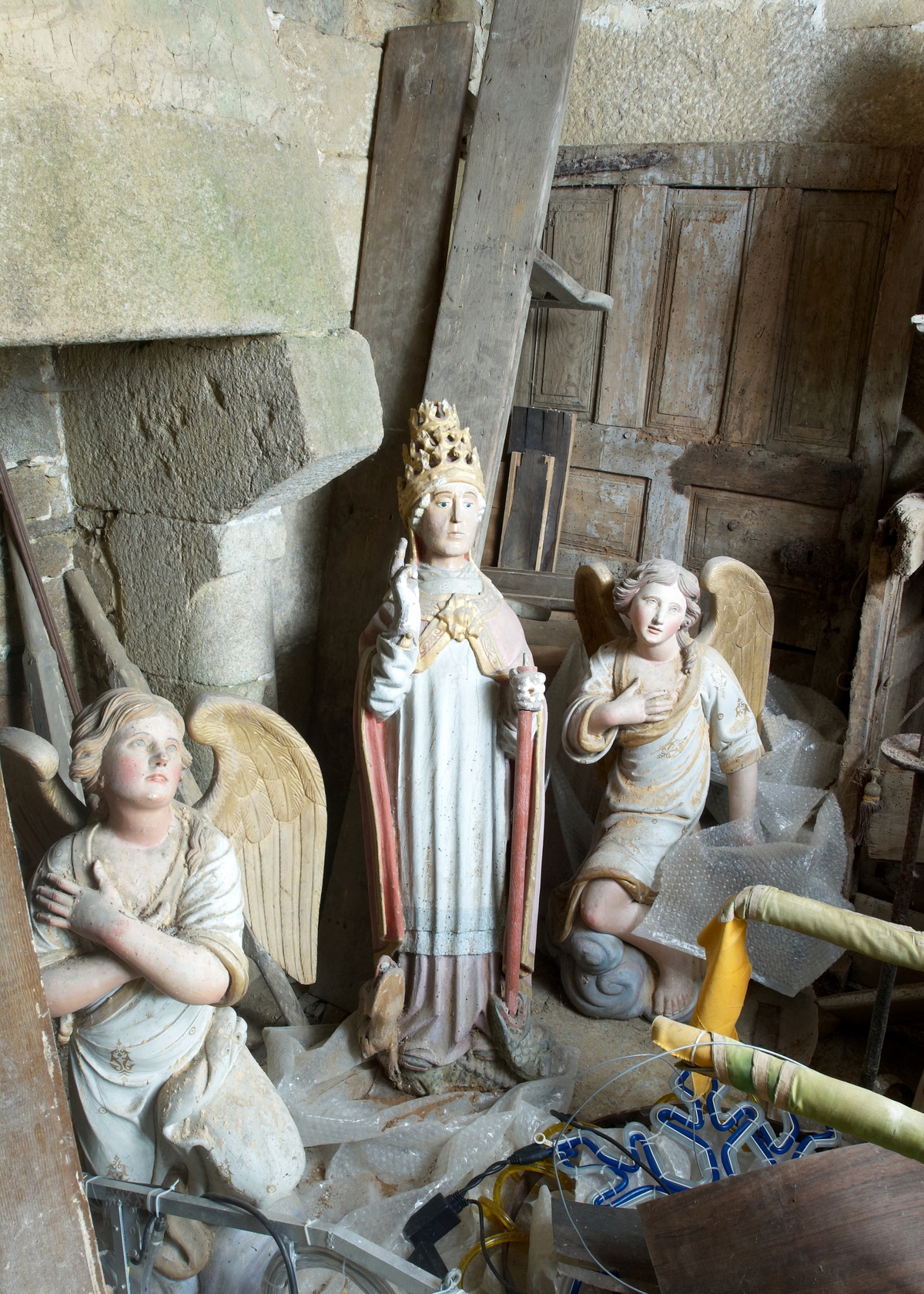 Plouzélambre, le bourg, enclos paroissial : église Saint-Sylvestre, porche monumental sud, secrétairerie située à l'étage. Du mobilier de l'église est entreposé dans cette pièce : ici, deux anges adorateurs en plâtre et saint Sylvestre (19e siècle)Immatriculation