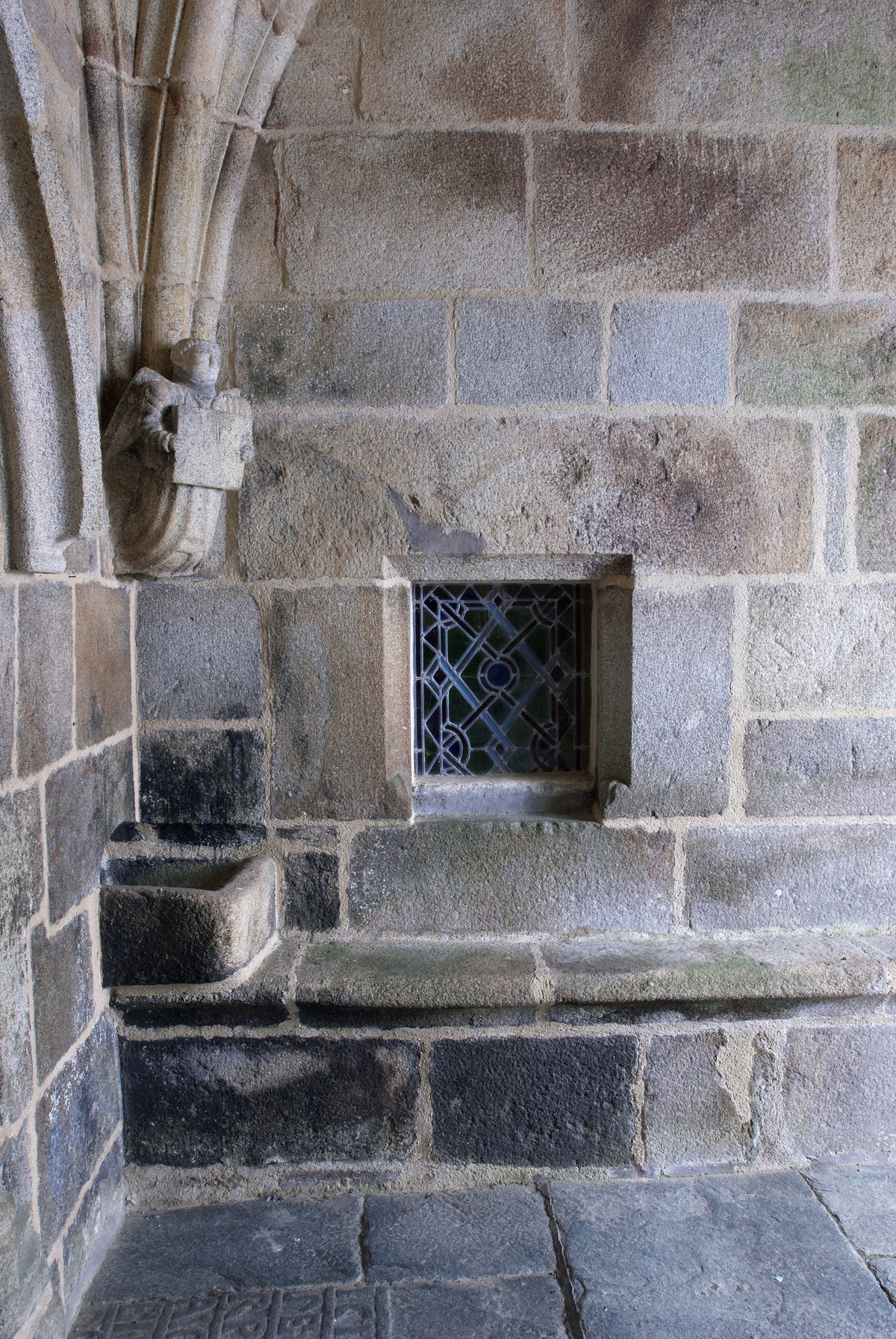 Plouzélambre, le bourg, enclos paroissial : église Saint-Sylvestre, porche monumental sud, détail de la fenêtre intérieure permettant d'observer le choeurImmatriculation