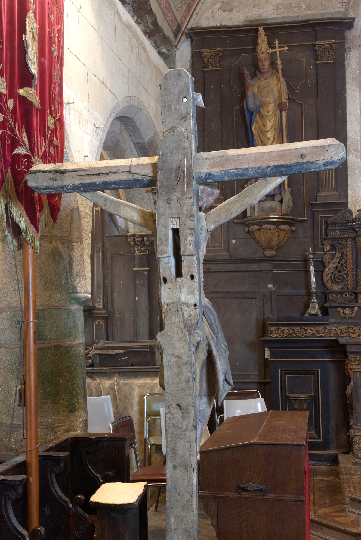 Plouzélambre, le bourg, enclos paroissial : église Saint-Sylvestre, Crucifix en bois polychrome (15e siècle), reversImmatriculation