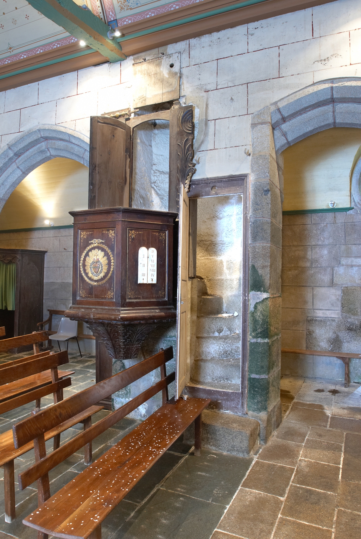 Plouzélambre, le bourg, enclos paroissial : église Saint-Sylvestre, chaire à prêcher (1837) et son escalier d'accès. Cet escalier – vraisemblablement datable du 15e siècle, servait sans doute d'accès à la tribune d'un jubé (disparu)Immatriculation