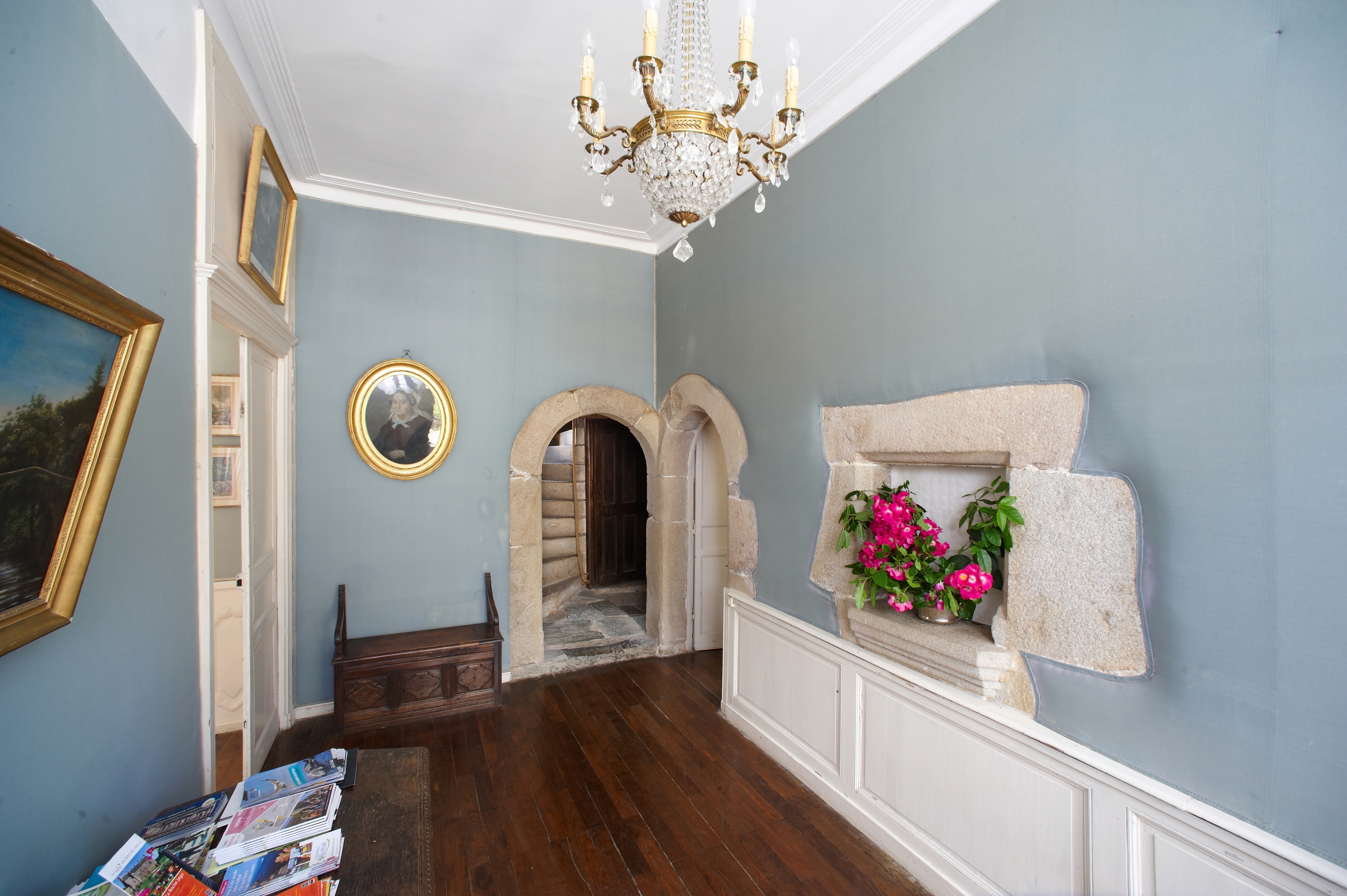 Château. Vestibule d'entrée avec passe-plats et porte jumelées de la tour d'escalier et de l'ancienne cuisine. Vue généraleImmatriculation