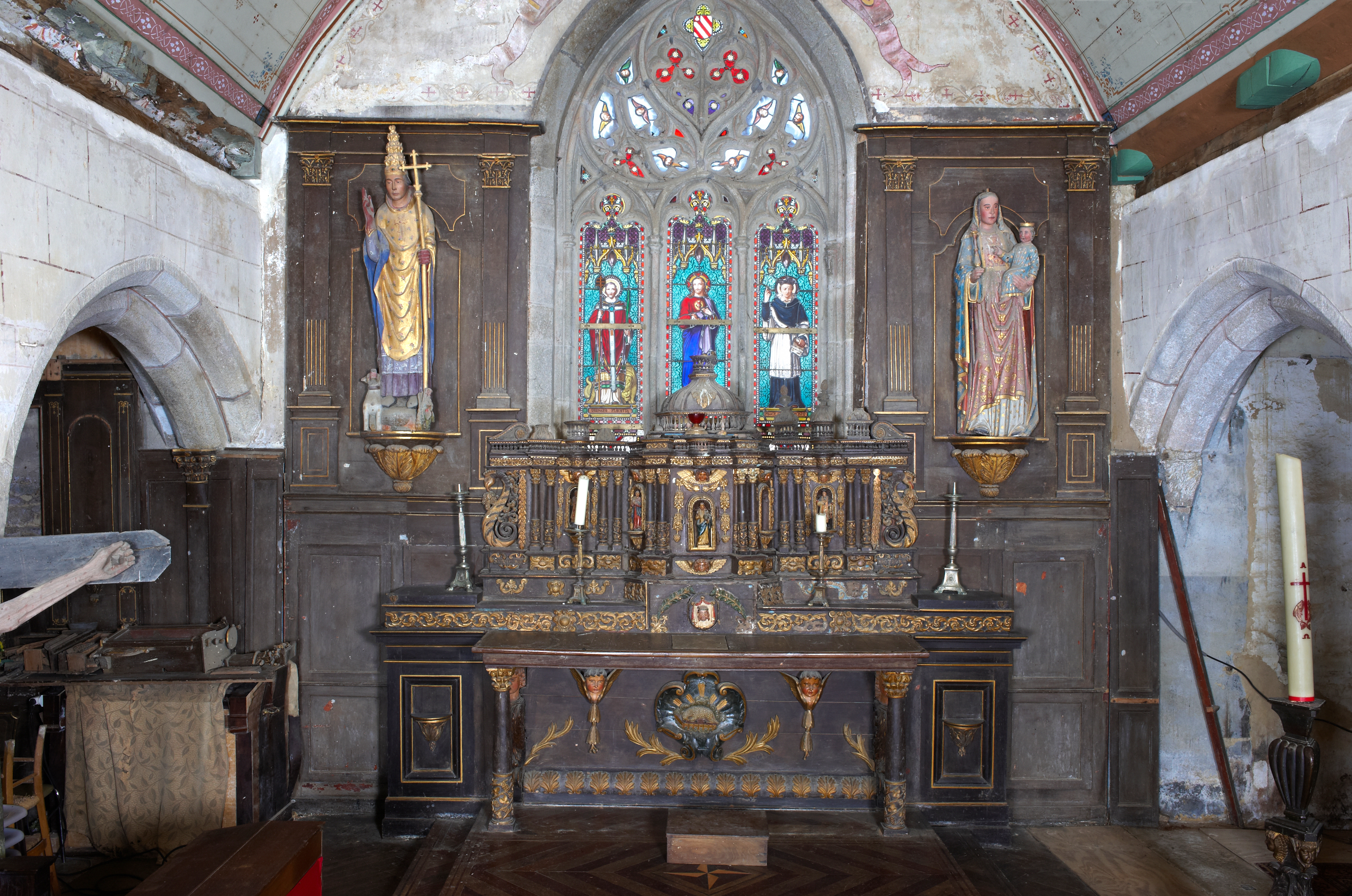 Plouzélambre, le bourg, enclos paroissial : église Saint-Sylvestre, vue intérieure, choeur, retable daté 1675 et autel de choeur (19e siècle). En chêne peint et doré, il est richement sculpté : rinceaux, colonnes et têtes d'anges... Il apparaît sous un glacis marron et des bronzines sombres. A droite : Vierge à l'enfant, à gauche : saint SylvestreImmatriculation
