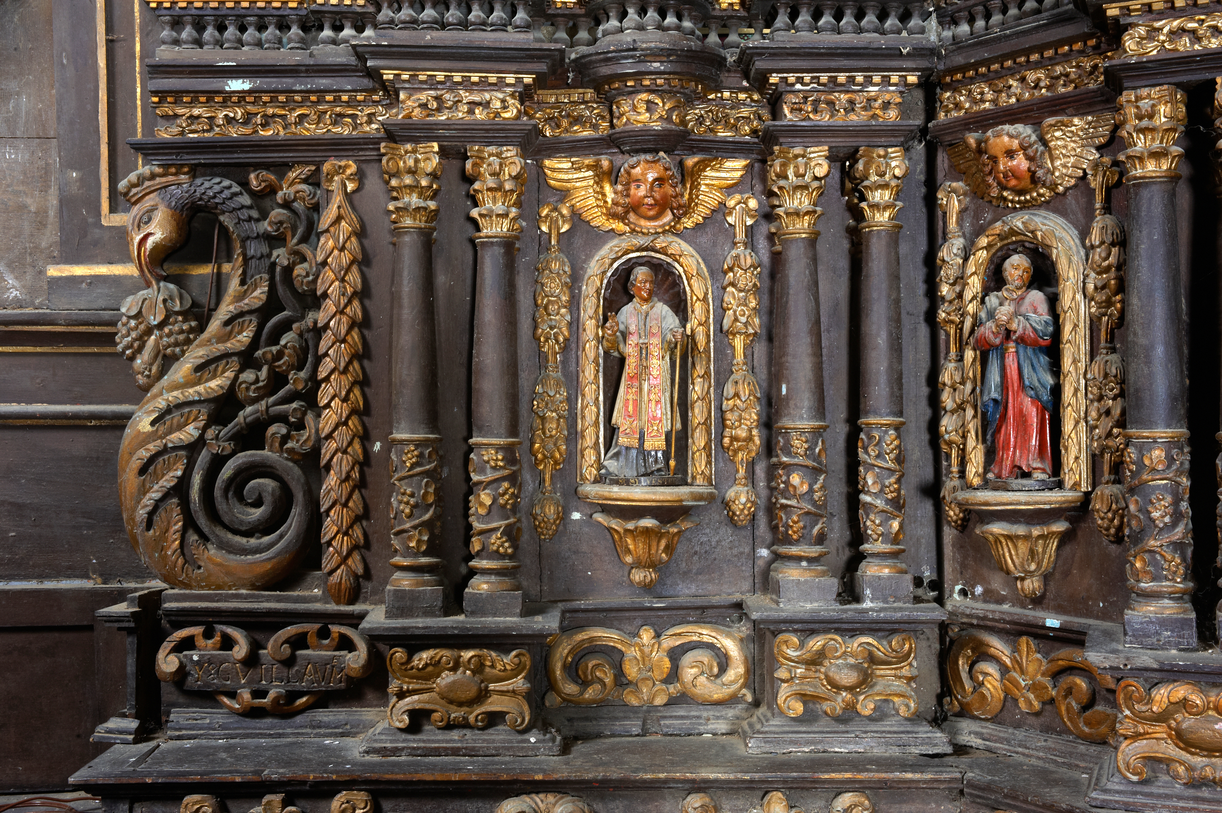 Plouzélambre, le bourg, enclos paroissial : église Saint-Sylvestre, vue intérieure, choeur, détail du retable daté 1675. En chêne peint et doré, il est richement sculpté : rinceaux, colonnes et têtes d'anges... Il apparaît sous un glacis marron et des bronzines sombresImmatriculation
