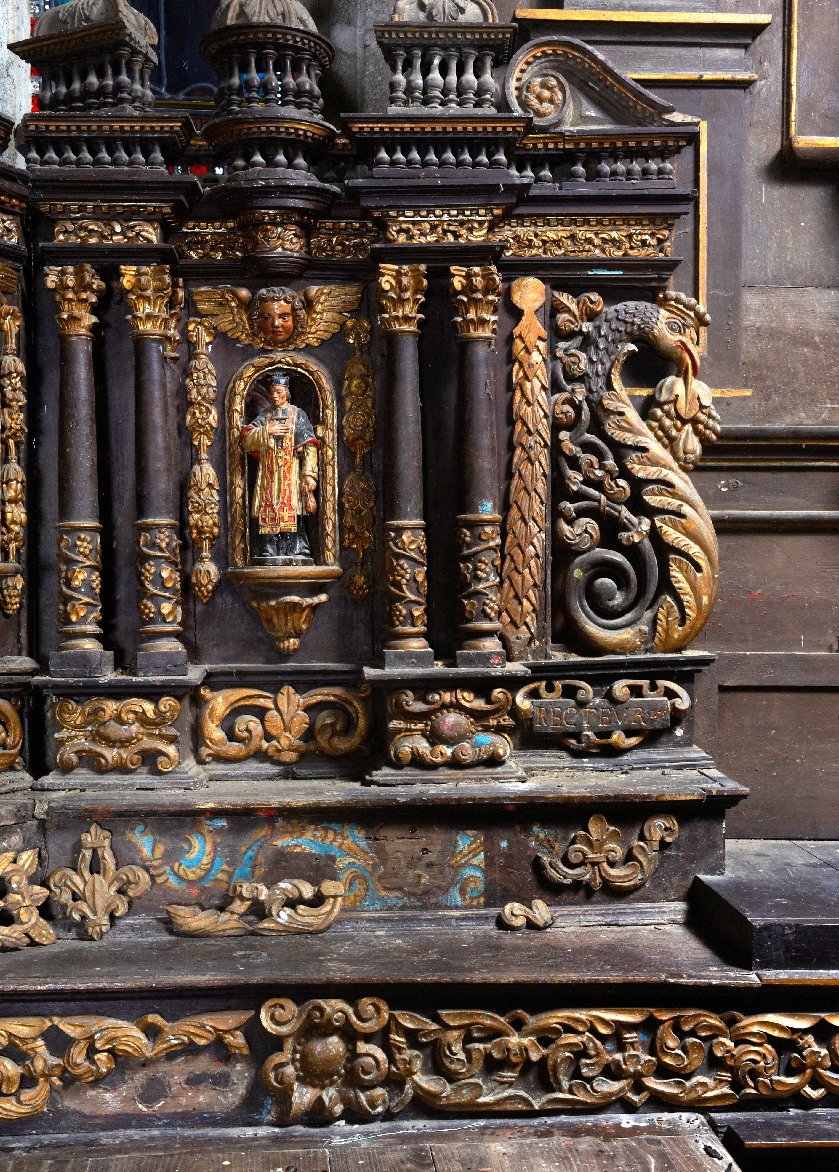 Plouzélambre, le bourg, enclos paroissial : église Saint-Sylvestre, vue intérieure, choeur, détail du retable daté 1675. En chêne peint et doré, il est richement sculpté : rinceaux, colonnes et têtes d'anges... Il apparaît sous un glacis marron et des bronzines sombres. Des traces de polychromie originelle aux couleurs vives sont cependant visiblesImmatriculation