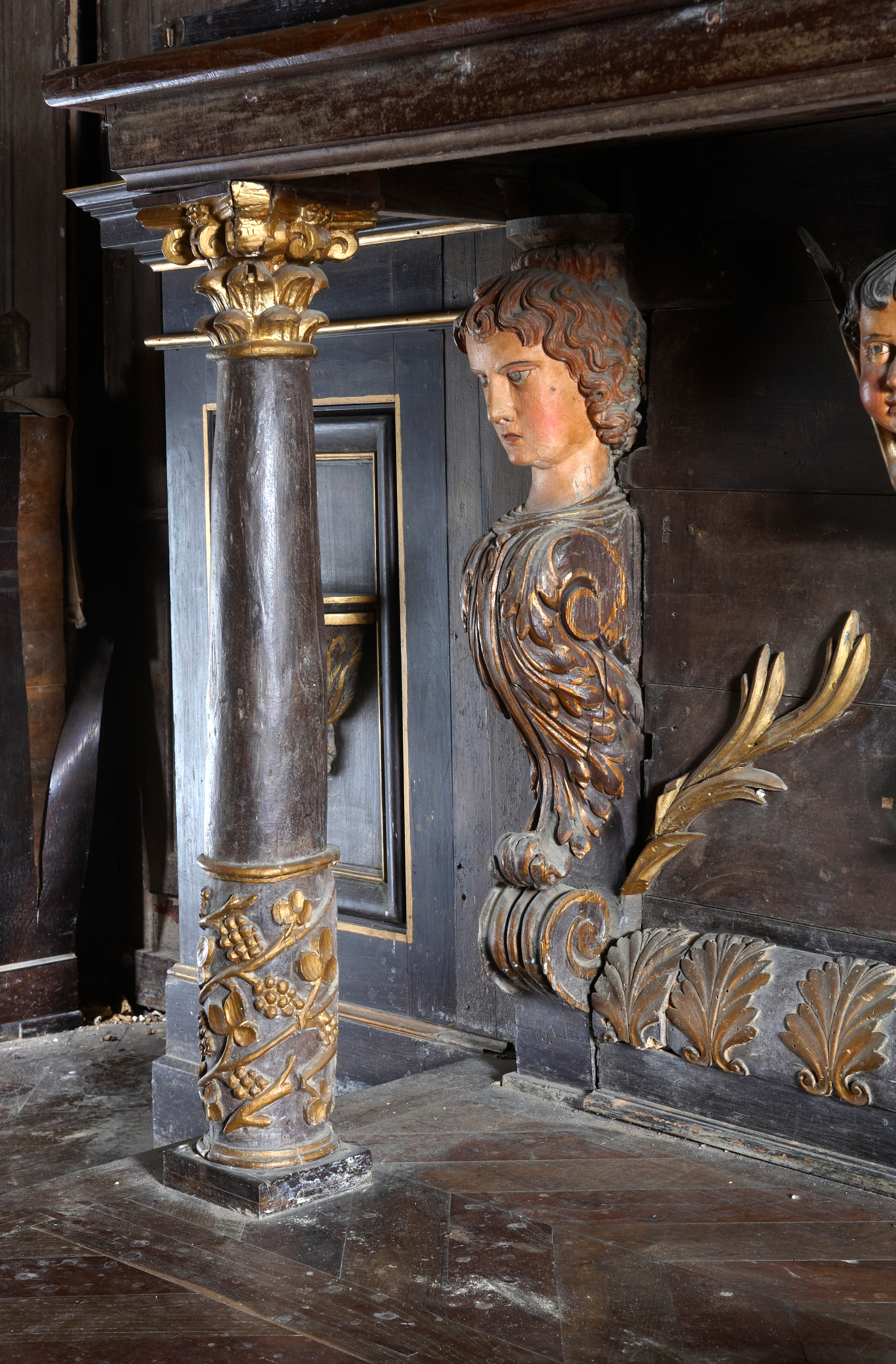 Plouzélambre, le bourg, enclos paroissial : église Saint-Sylvestre, vue intérieure, choeur, détail du retable daté 1675. En chêne peint et doré, il est richement sculpté : rinceaux, colonnes et têtes d'anges... Il apparaît sous un glacis marron et des bronzines sombresImmatriculation