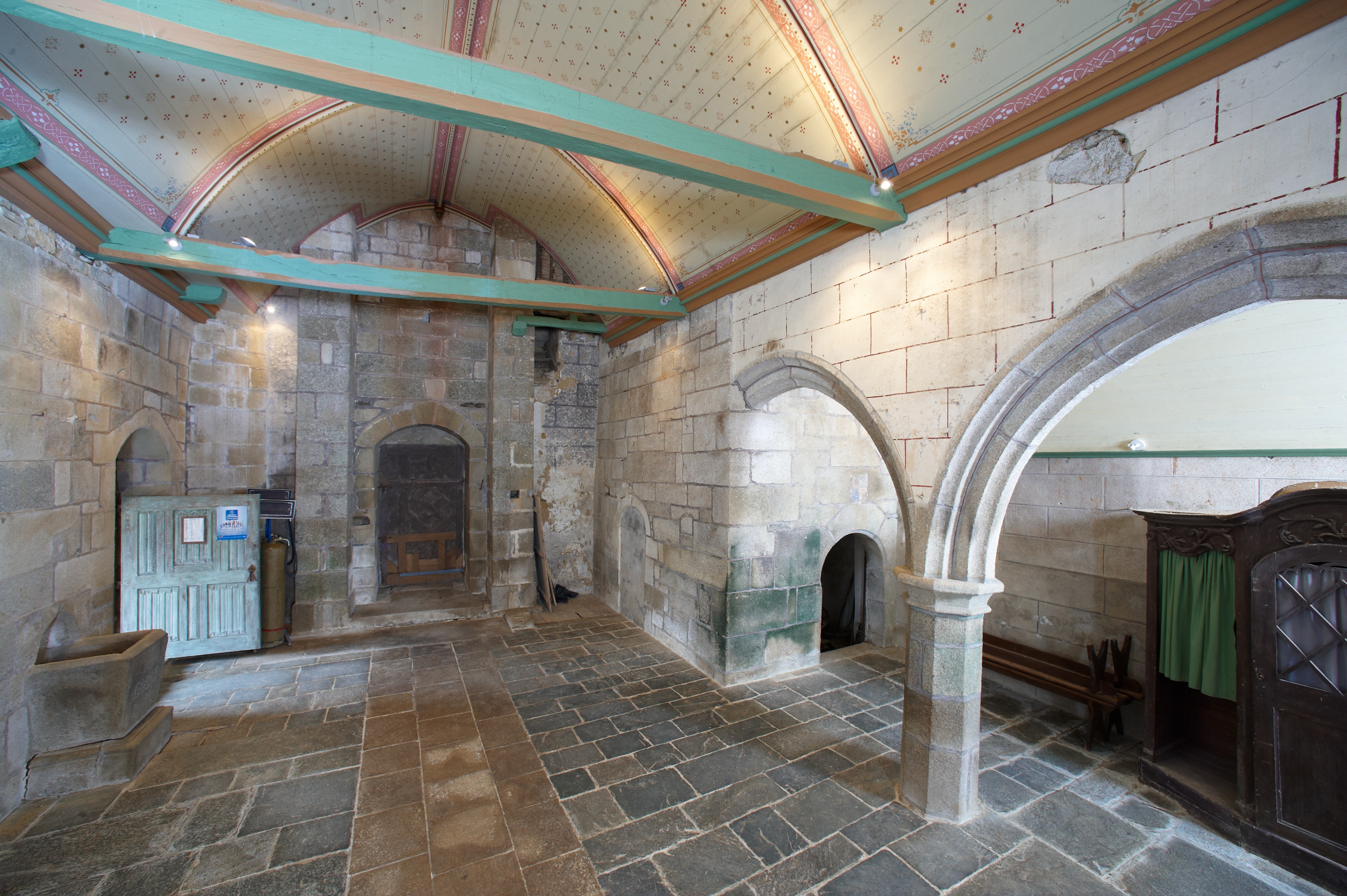 Plouzélambre, le bourg, enclos paroissial : église Saint-Sylvestre, vue intérieure, nef, extrémité ouest. A droite : porte de la chapelle des fonts baptismaux ; à gauche : porte du porcheImmatriculation