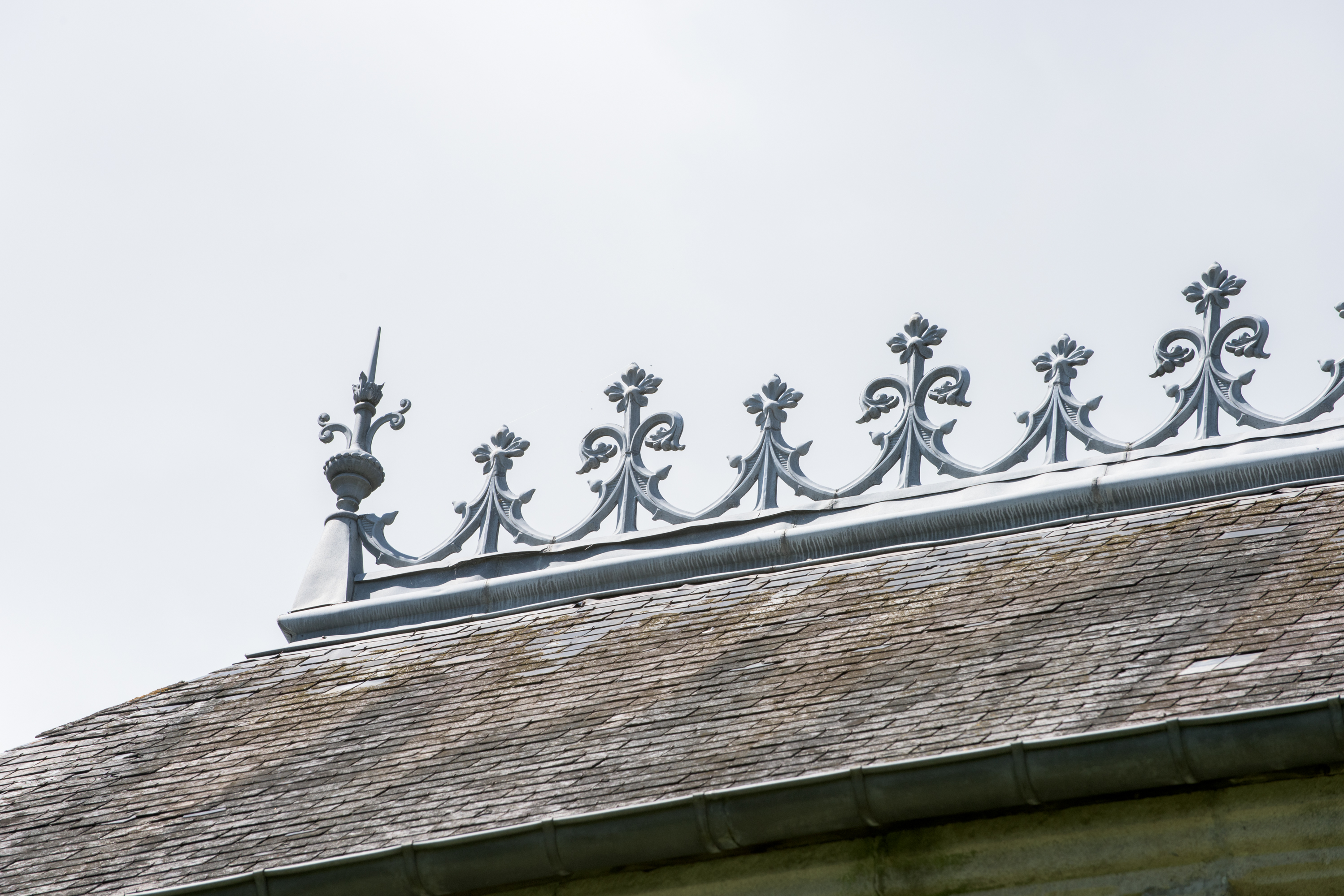 Détail d'un épi de faîtage et de la crête de toitImmatriculation