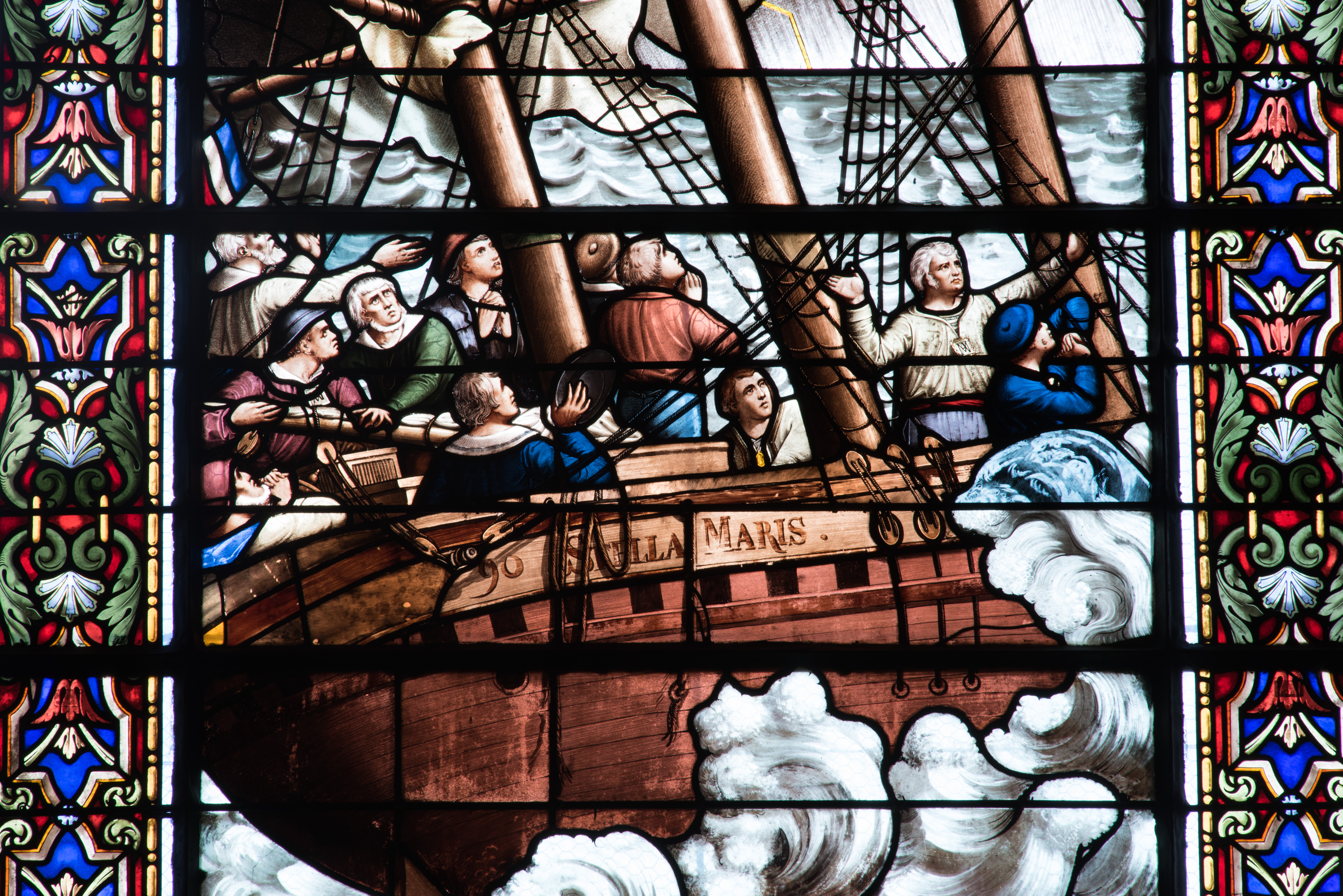 Détail du vitrail : le bateau "Stella Maris"Immatriculation
