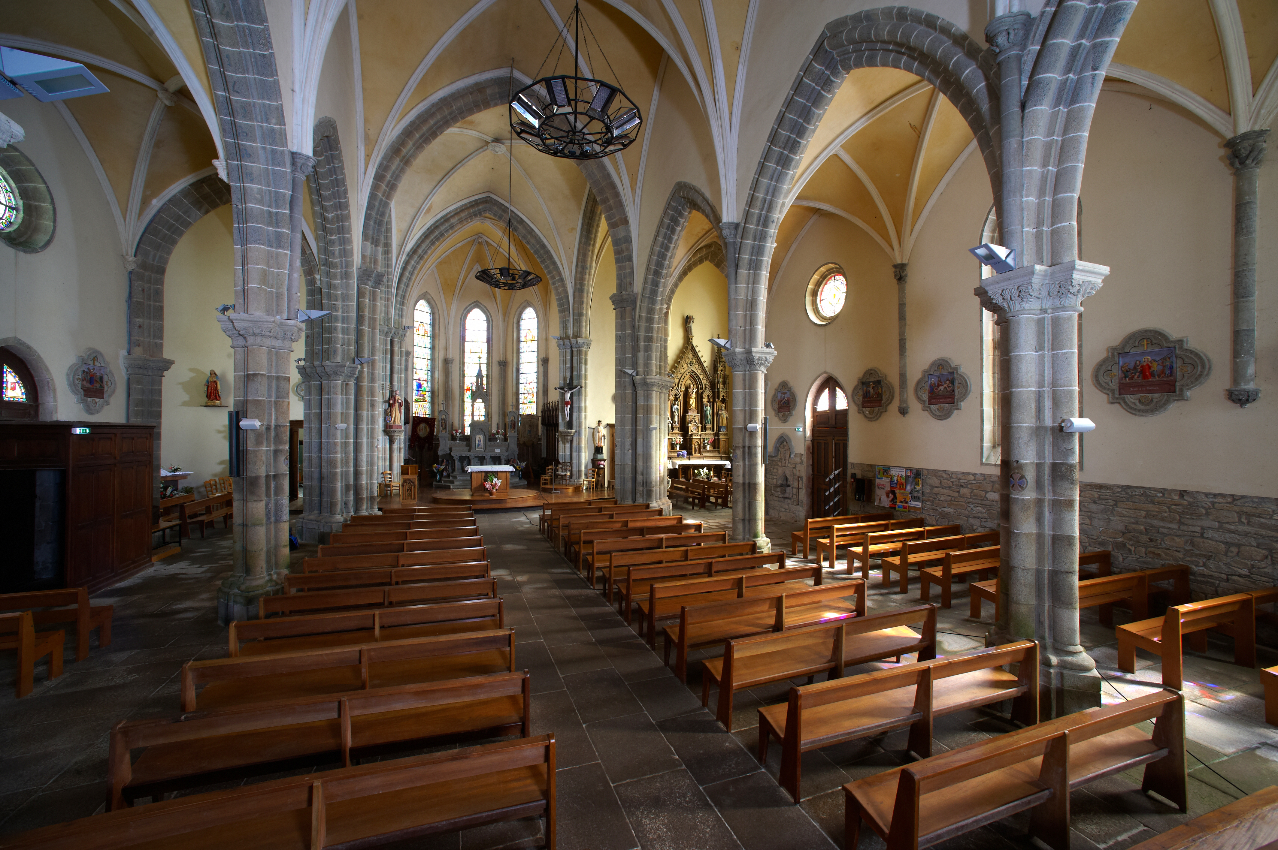 Rospez, le bourg : église paroissiale, nef et collatéraux depuis la porte occidentaleImmatriculation