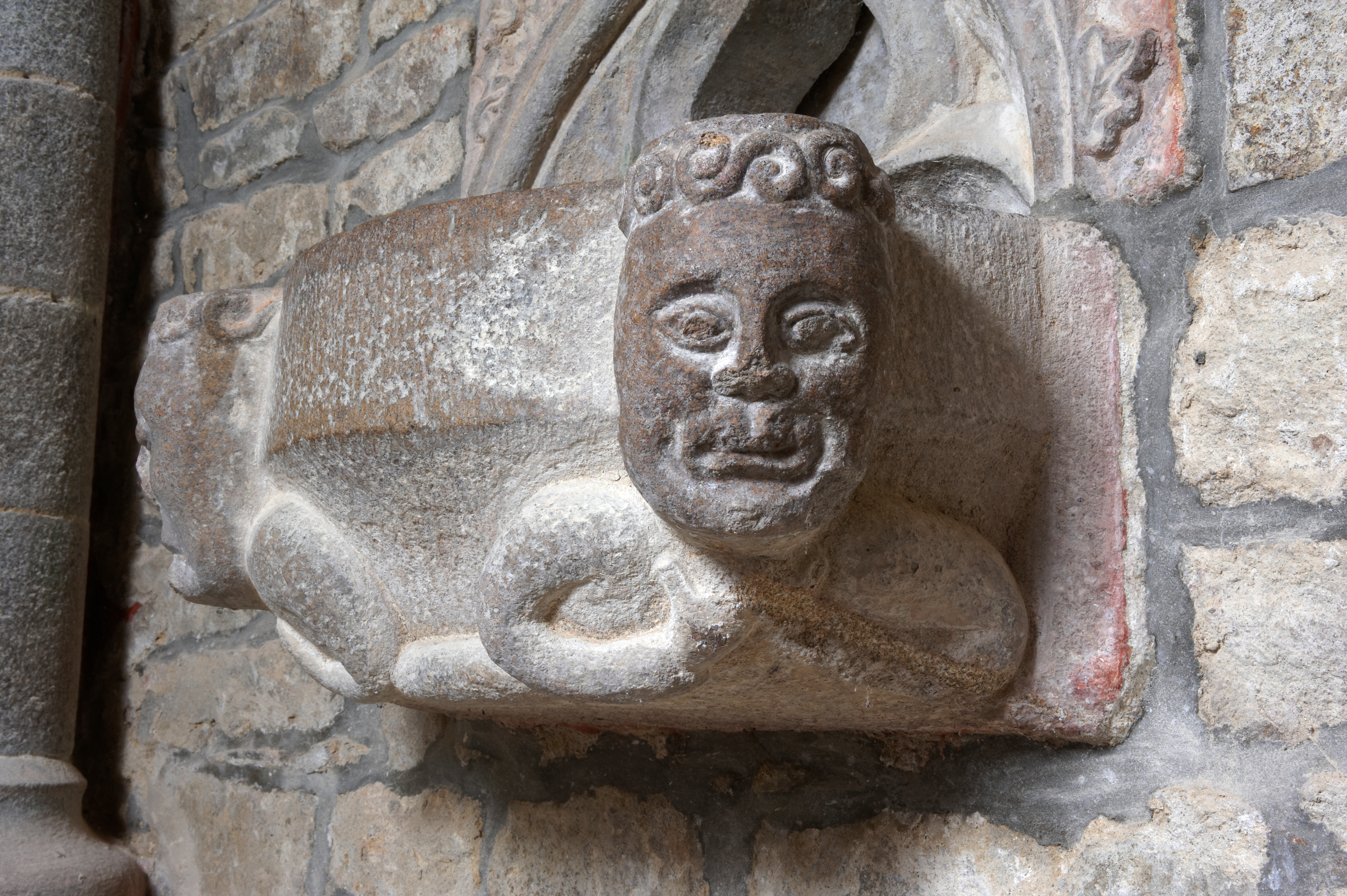 Rospez, le bourg : église paroissiale, détail d'un personnage sculpté sur l'ancien bénitierImmatriculation