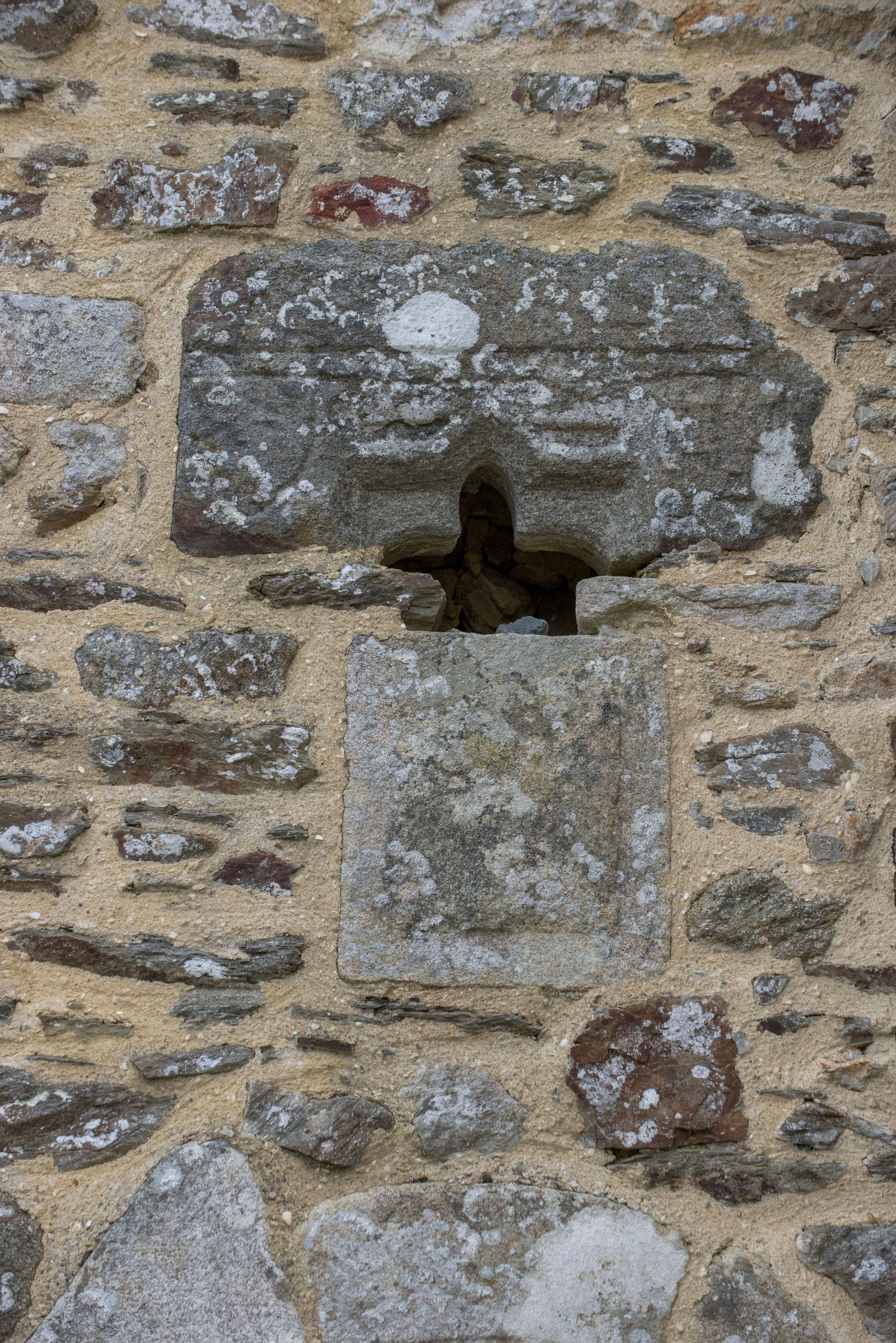 Détail d'un réemplois gothique et d'une armoirie marteléeImmatriculation