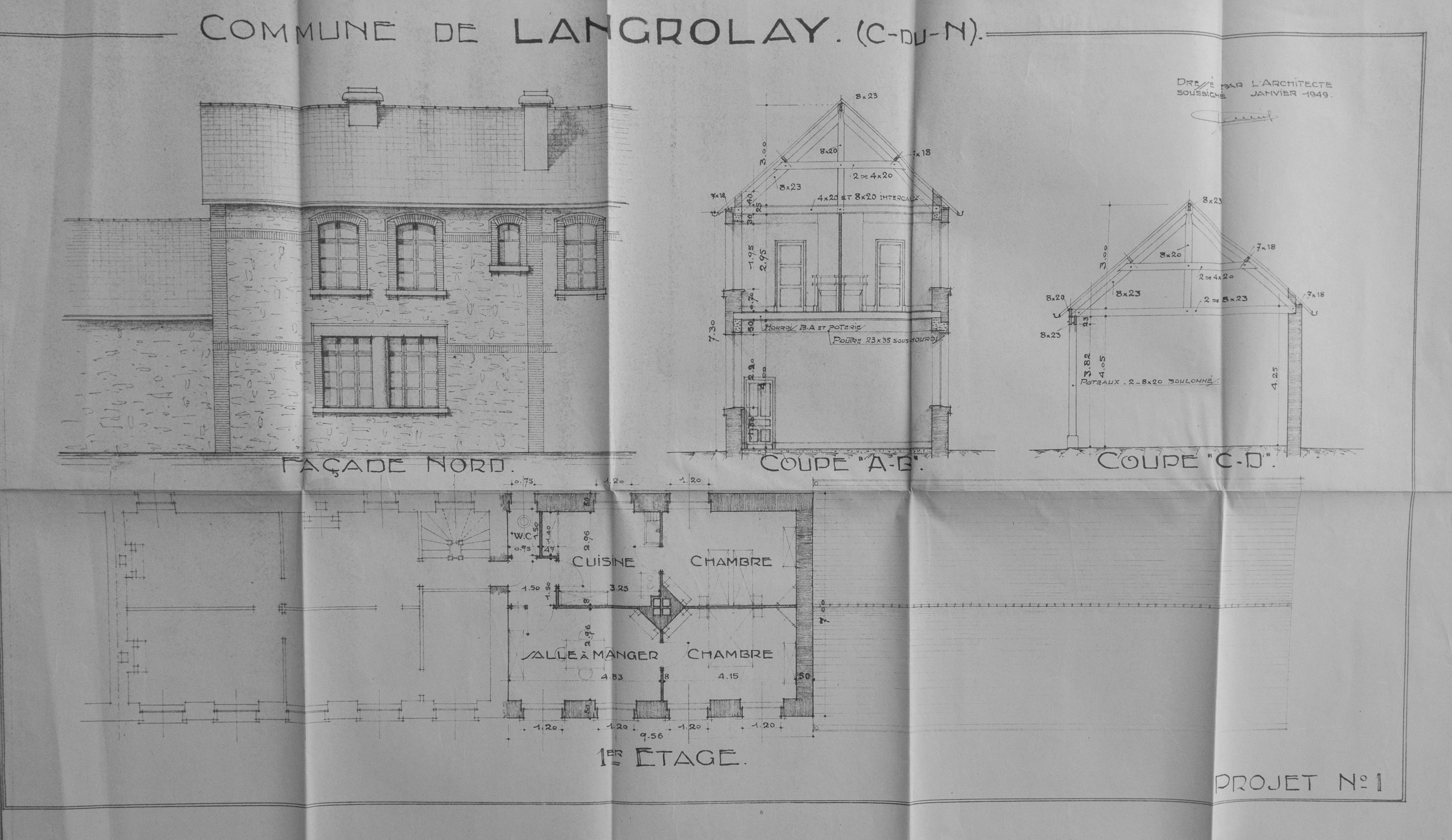 Plan de construction de la nouvelle école, façade est, 1949Immatriculation