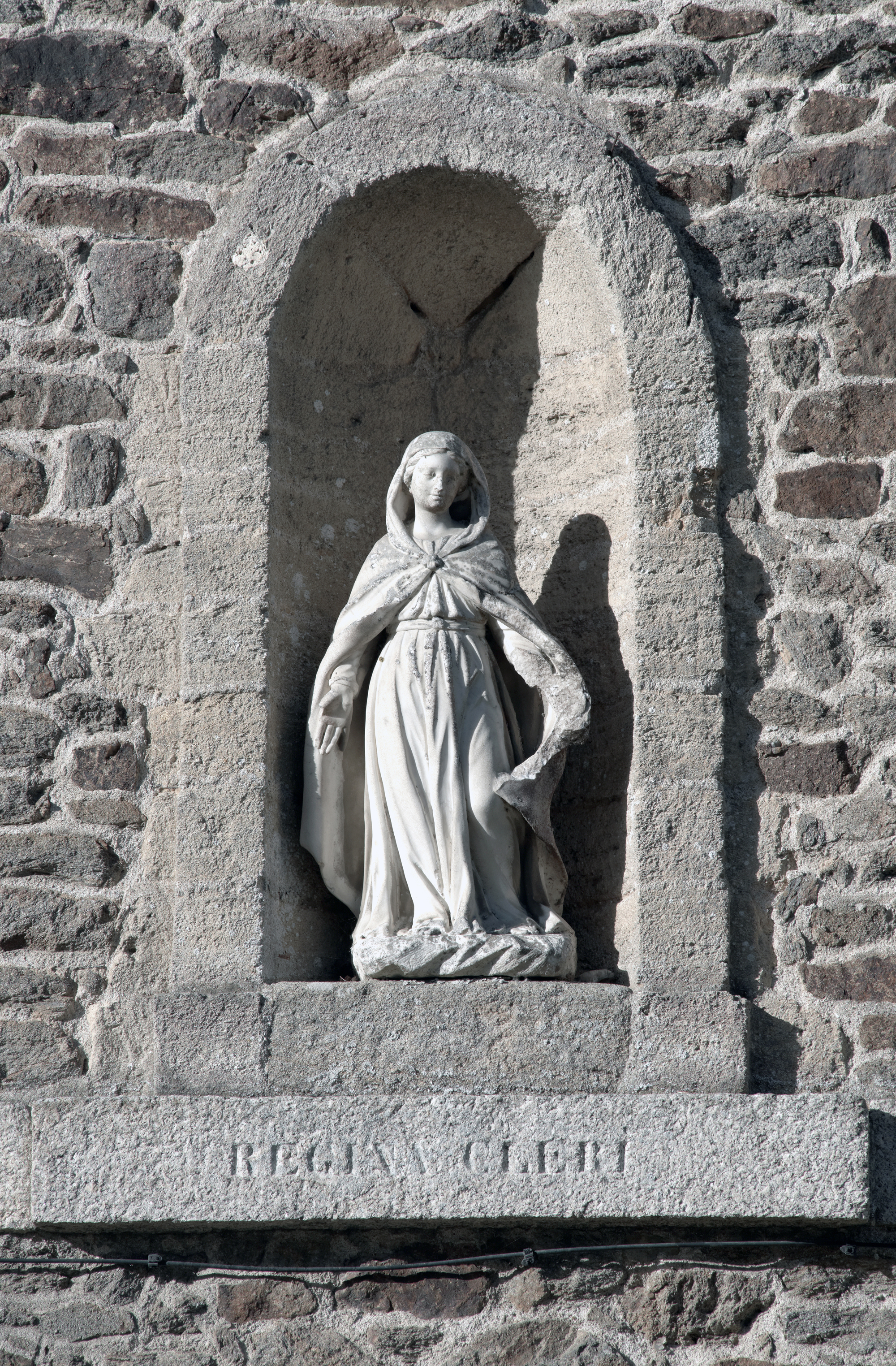 Place de l'Eglise, presbytère, niche avec statue de la Vierge, inscription : Regina Cleri (Reine du clergé)Immatriculation
