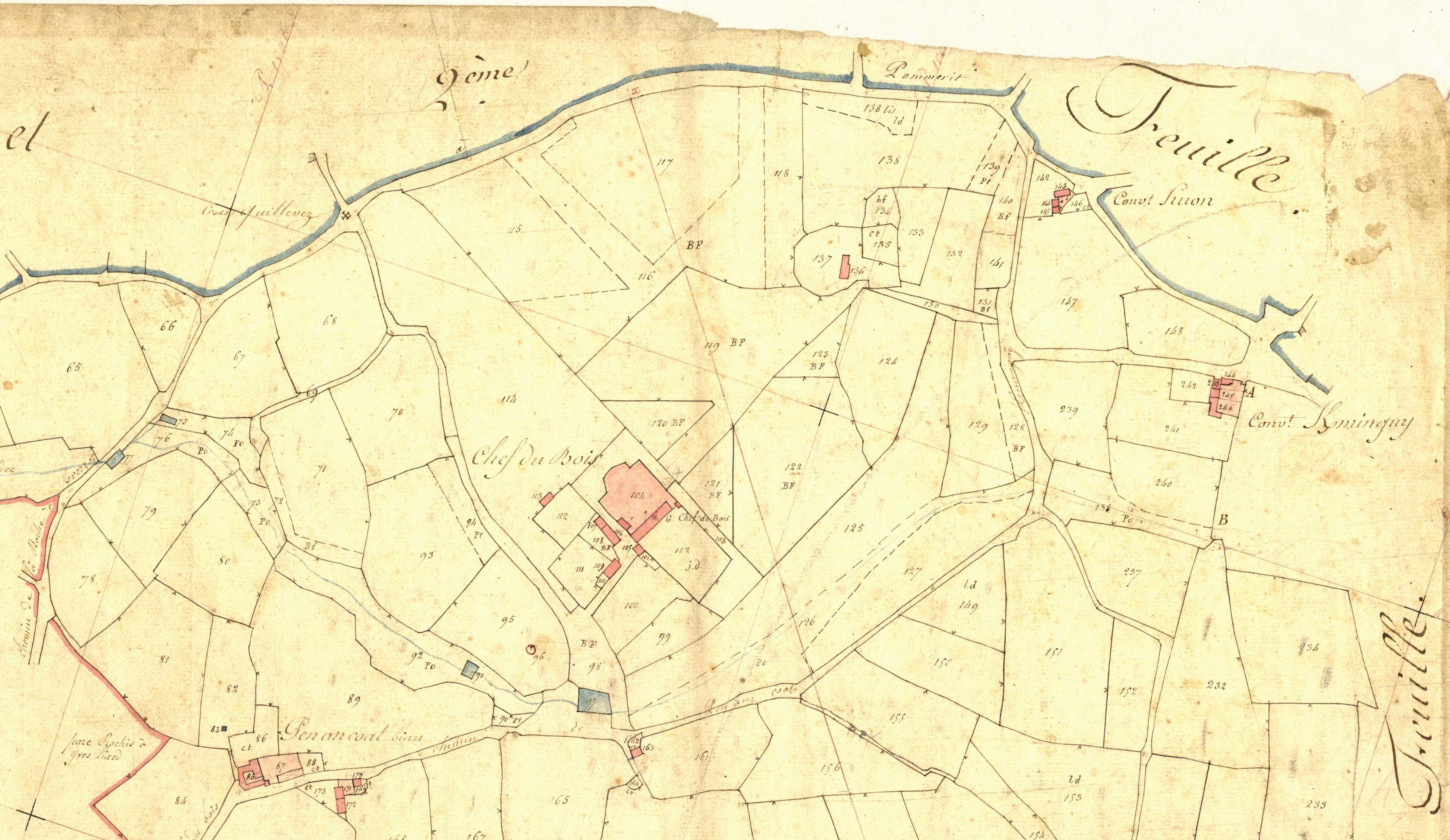 Le manoir de Chef du bois en 1835. Extrait du cadastre ancien, section A1 (A.D. 22, série 3 P)Immatriculation