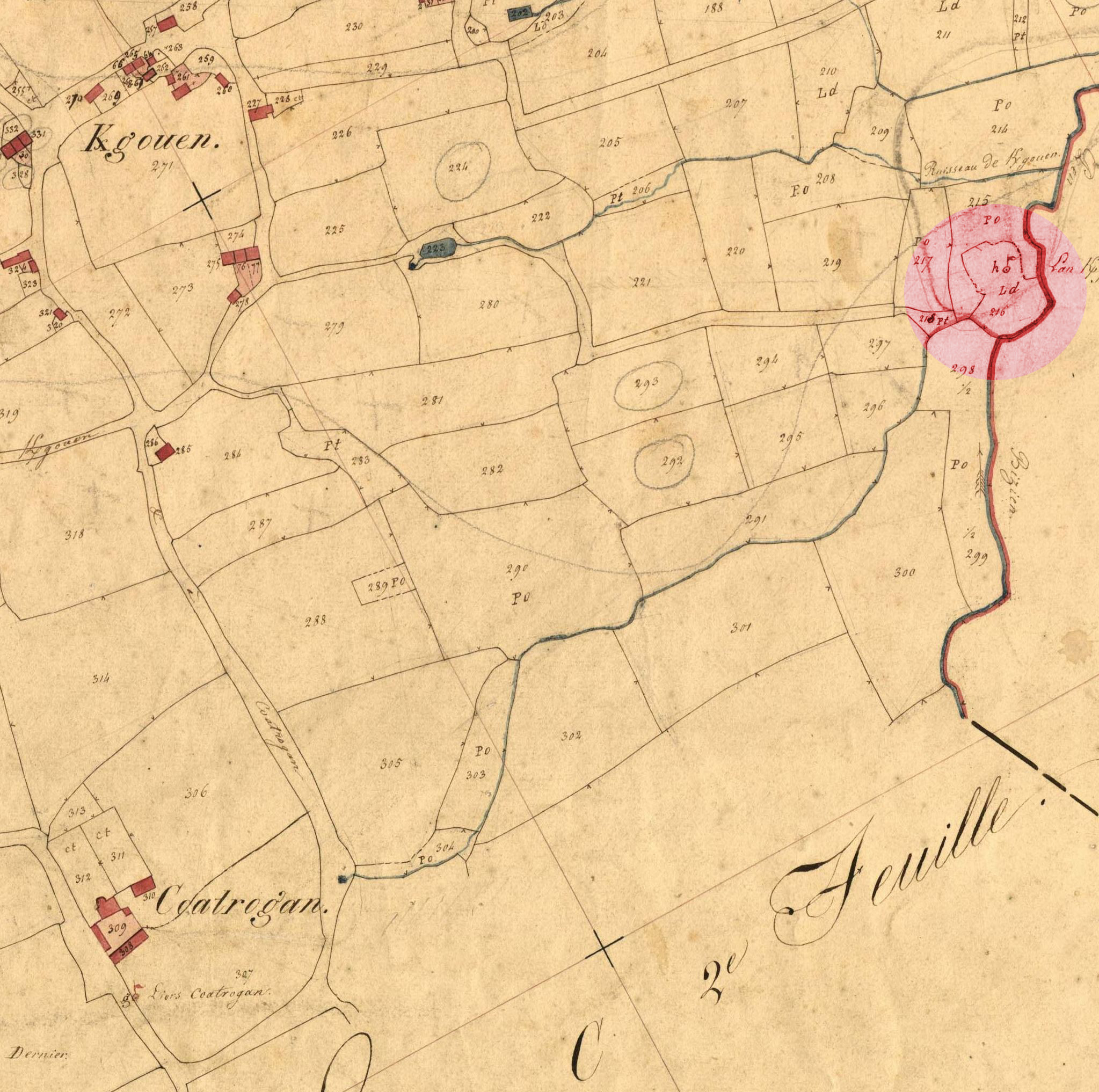 Pen Bizien. La motte castrale en 1835. Extrait du cadastre ancien, section C1 (A.D. 22, série 3P 247)Immatriculation