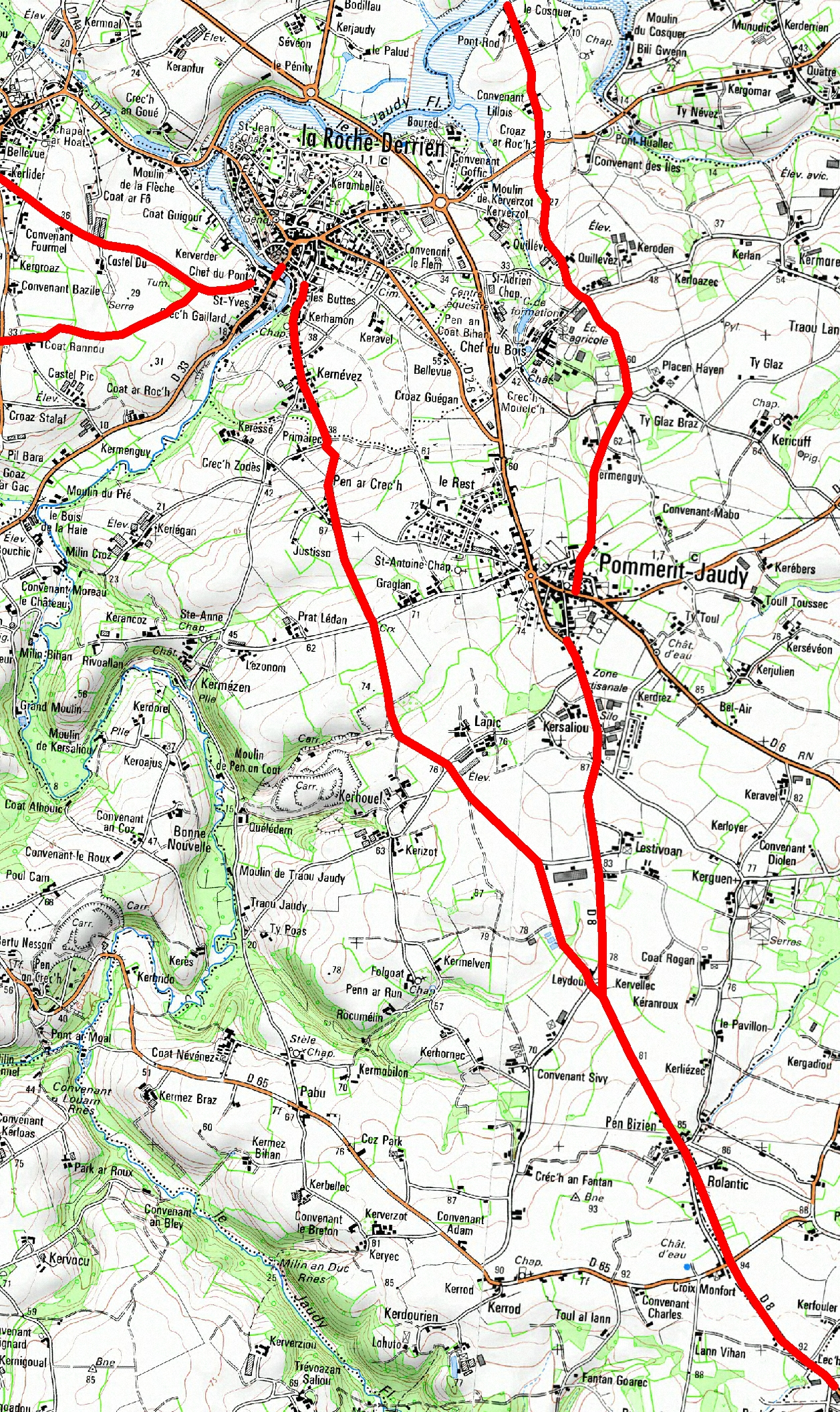 Extrait de carte IGN. Les deux tronçons de voies romaines traversant la commune de Runan vers Pont Rod et La Roche-DerrienImmatriculation