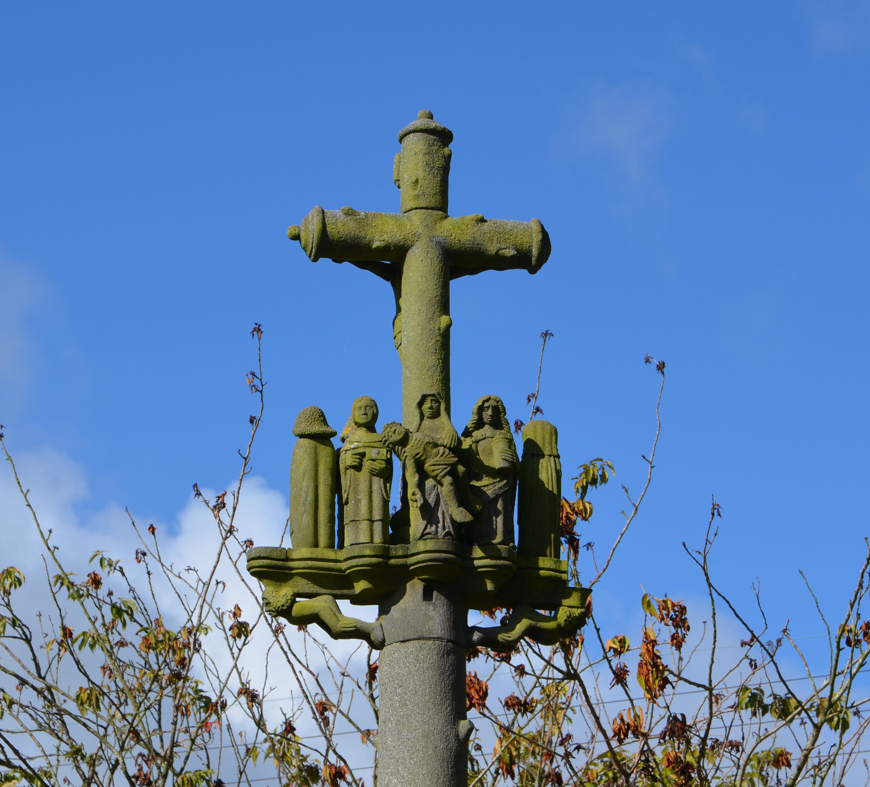 Trémel, le bourg : calvaire de l'église, détail de la croix sommitale et des personnages. Il porte l'inscription "MISSION 1865"Immatriculation
