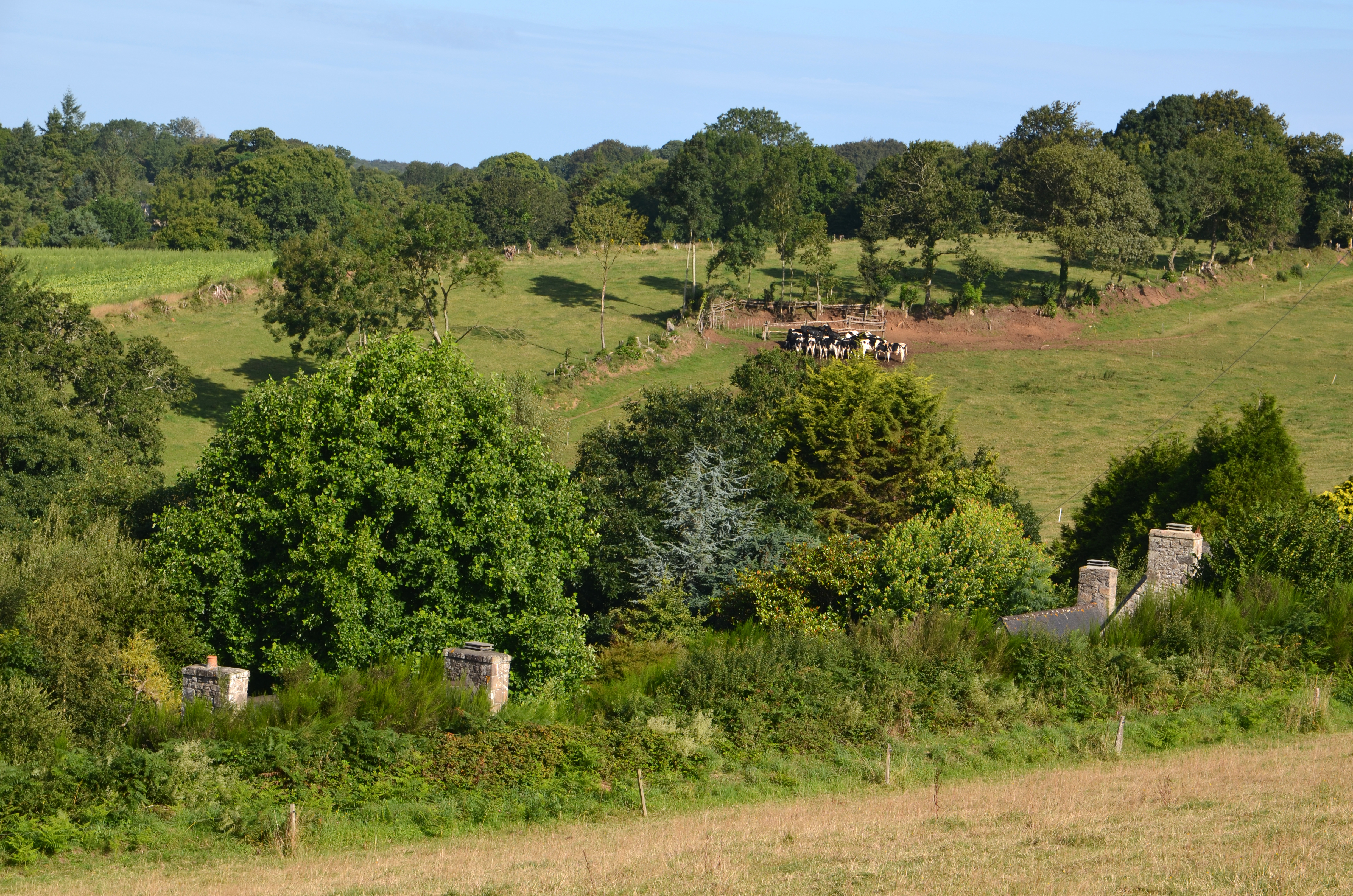 Trémel, Le Traon - Le Val : vue paysagère. L'habitat est protégé par le relief des vents d'est et du nordImmatriculation
