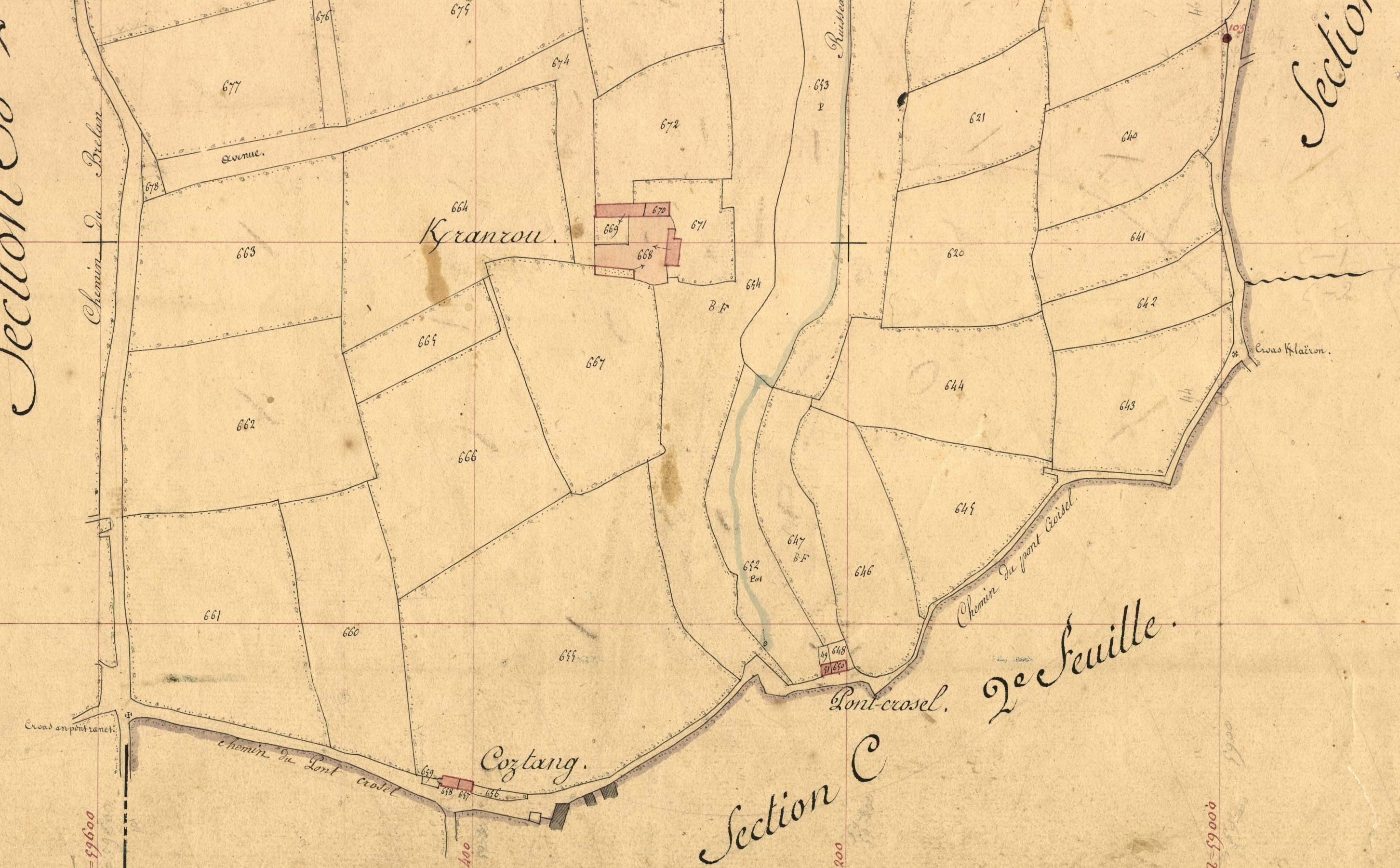 Extrait du cadastre ancien de la commune de Plufur, 1848 : Keranrou[x], Coz Tang, Pont-Crosel, Croaz K[er]laëronImmatriculation