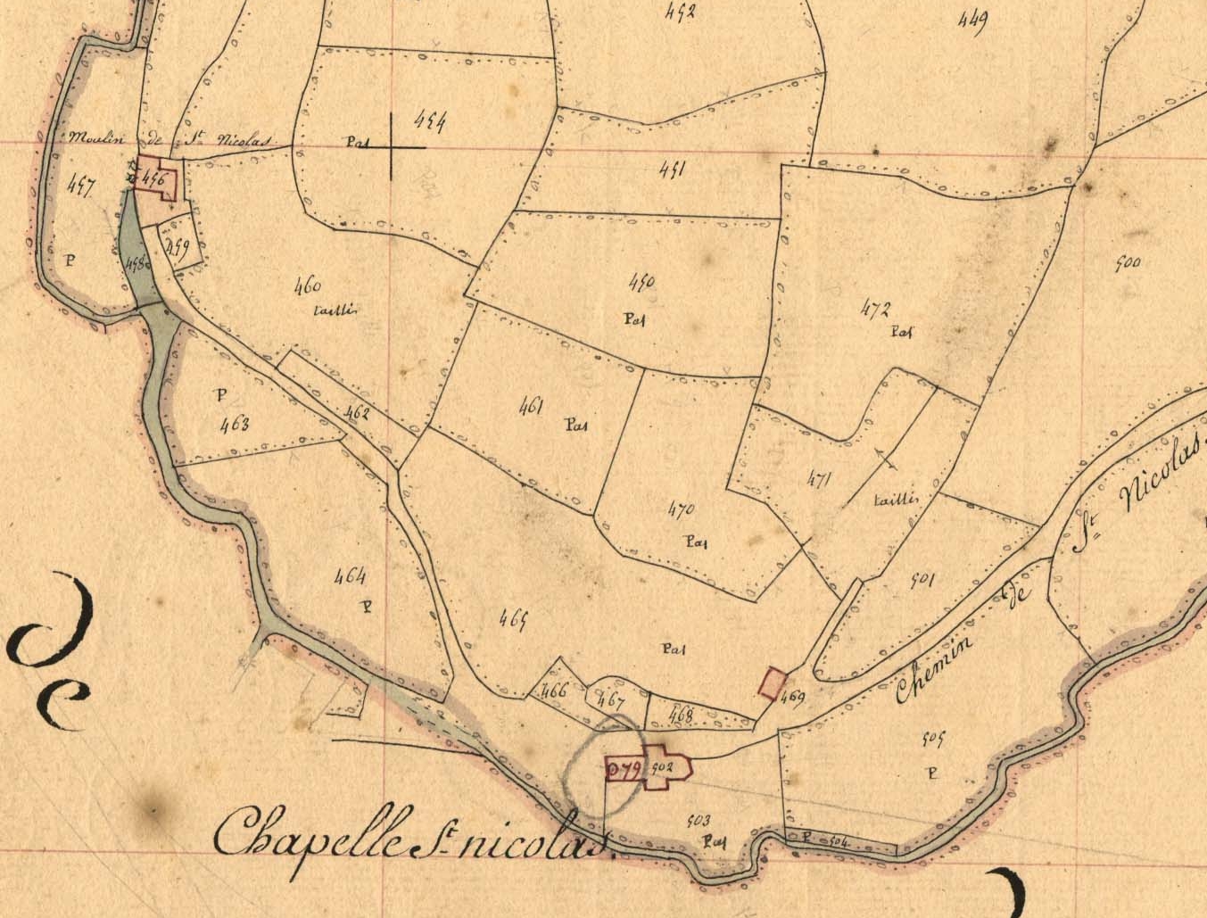 Extrait du cadastre ancien de la commune de Plufur, 1848 : chapelle Saint-Nicolas et moulinImmatriculation