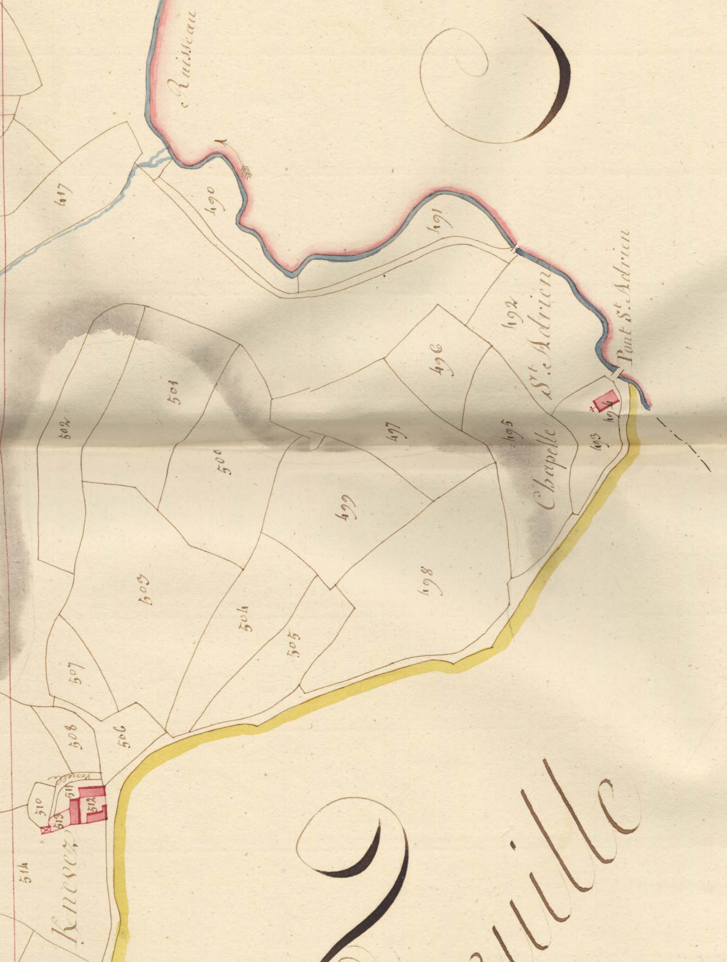 Extrait du cadastre ancien de la commune de Plufur, 1816 : Kernevez, Saint-Adrien (chapelle et pont)Immatriculation