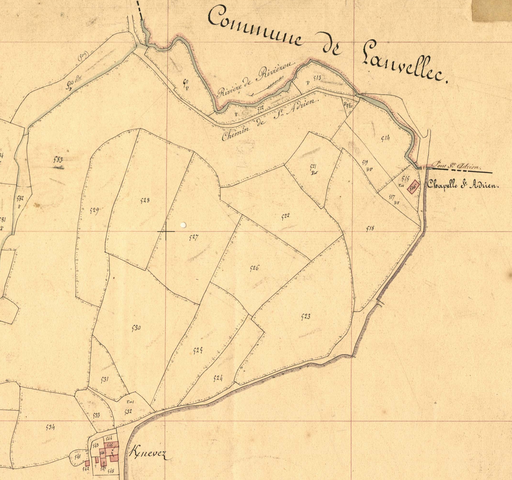 Extrait du cadastre ancien de la commune de Plufur, 1848 : Kernevez, Saint-Adrien (chapelle et pont)Immatriculation