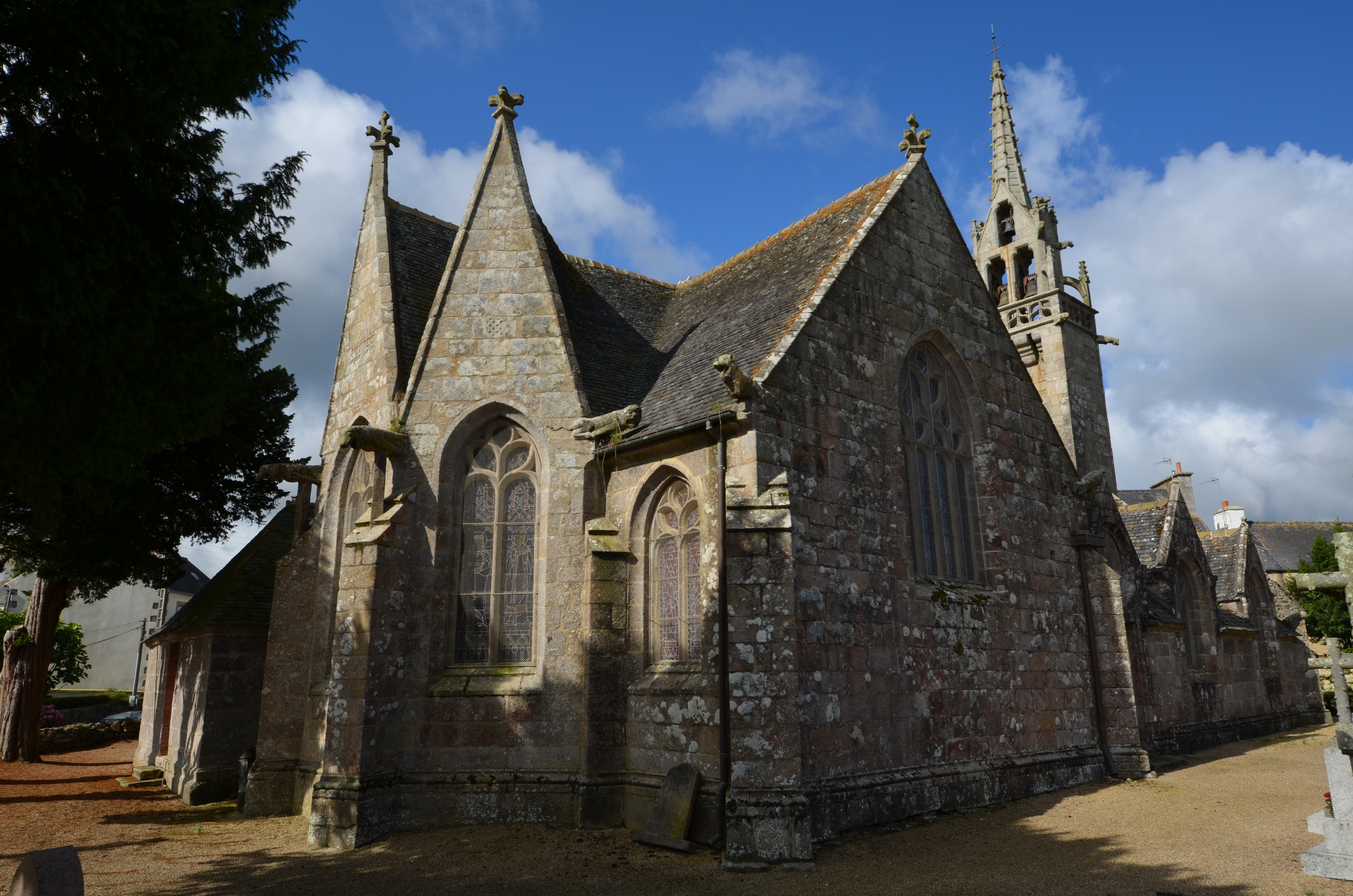 Trémel, le bourg : église paroissiale Notre-Dame, chevet à noues multiples (à trois pans très élancés ornés de crossettes sculptées et sommés d'un fleuron) et transept nordImmatriculation