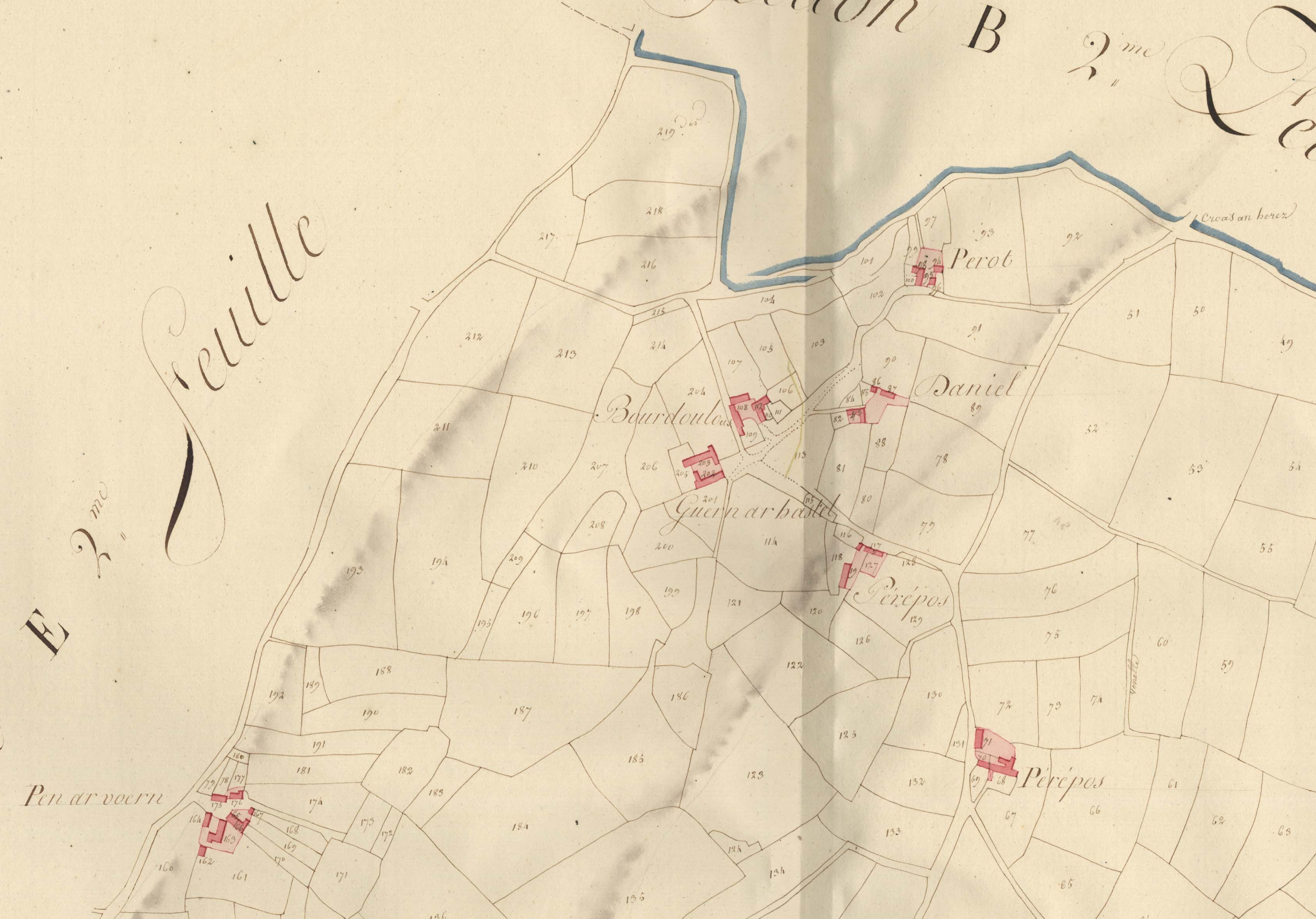 Extrait du cadastre ancien de la commune de Plufur, 1816 : Guern ar Hastel, Bourdoulous, Daniel, BéréposImmatriculation