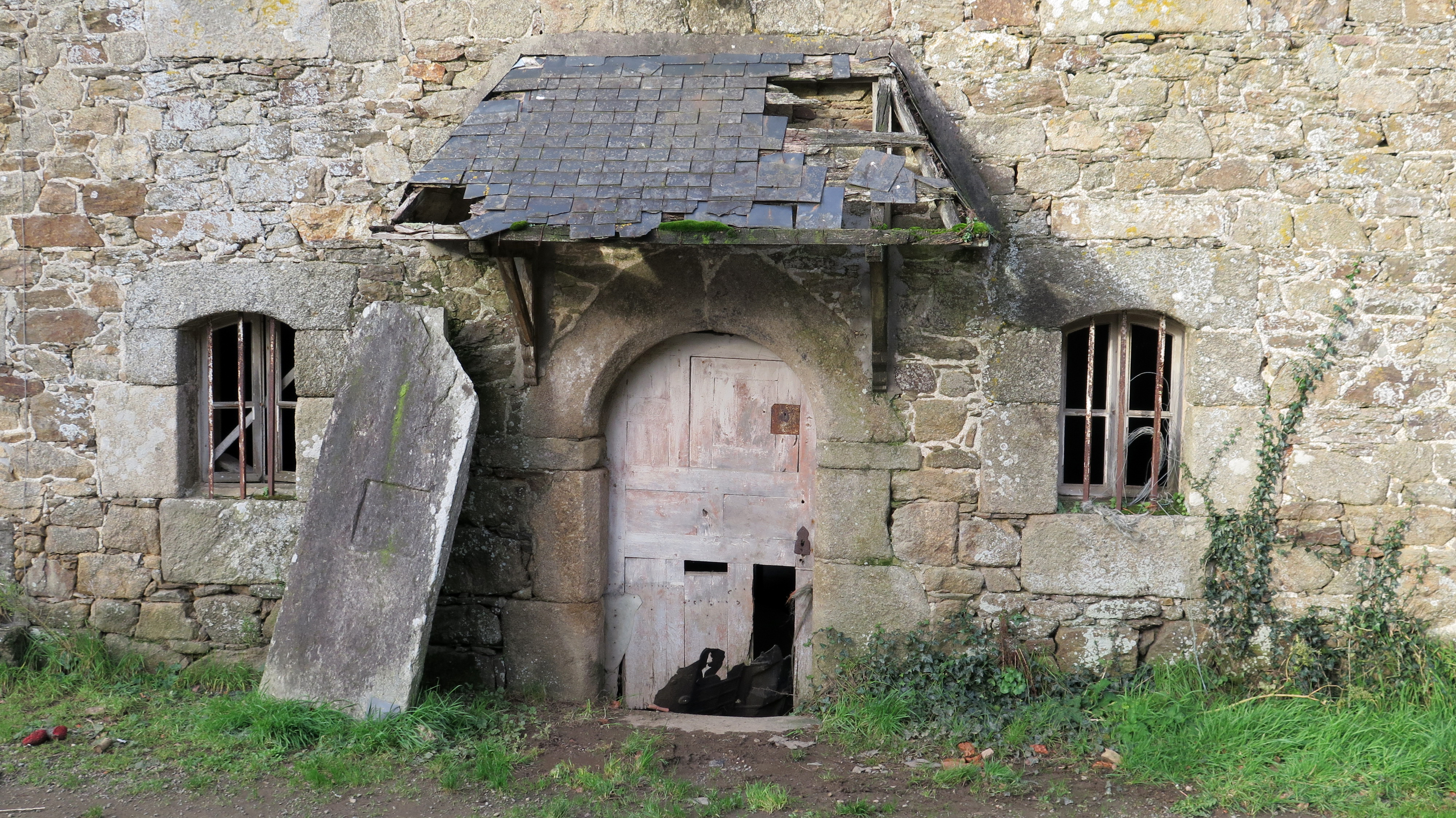 Plufur, Kerabalen Braz : logis de ferme, détail de l'élévation antérieure orientée vers le sud. Il porte les inscriptions suivantes : "F:F:M:I:LEBO/17/53" et "F:P:M:I:LE / BOT.1783"Immatriculation