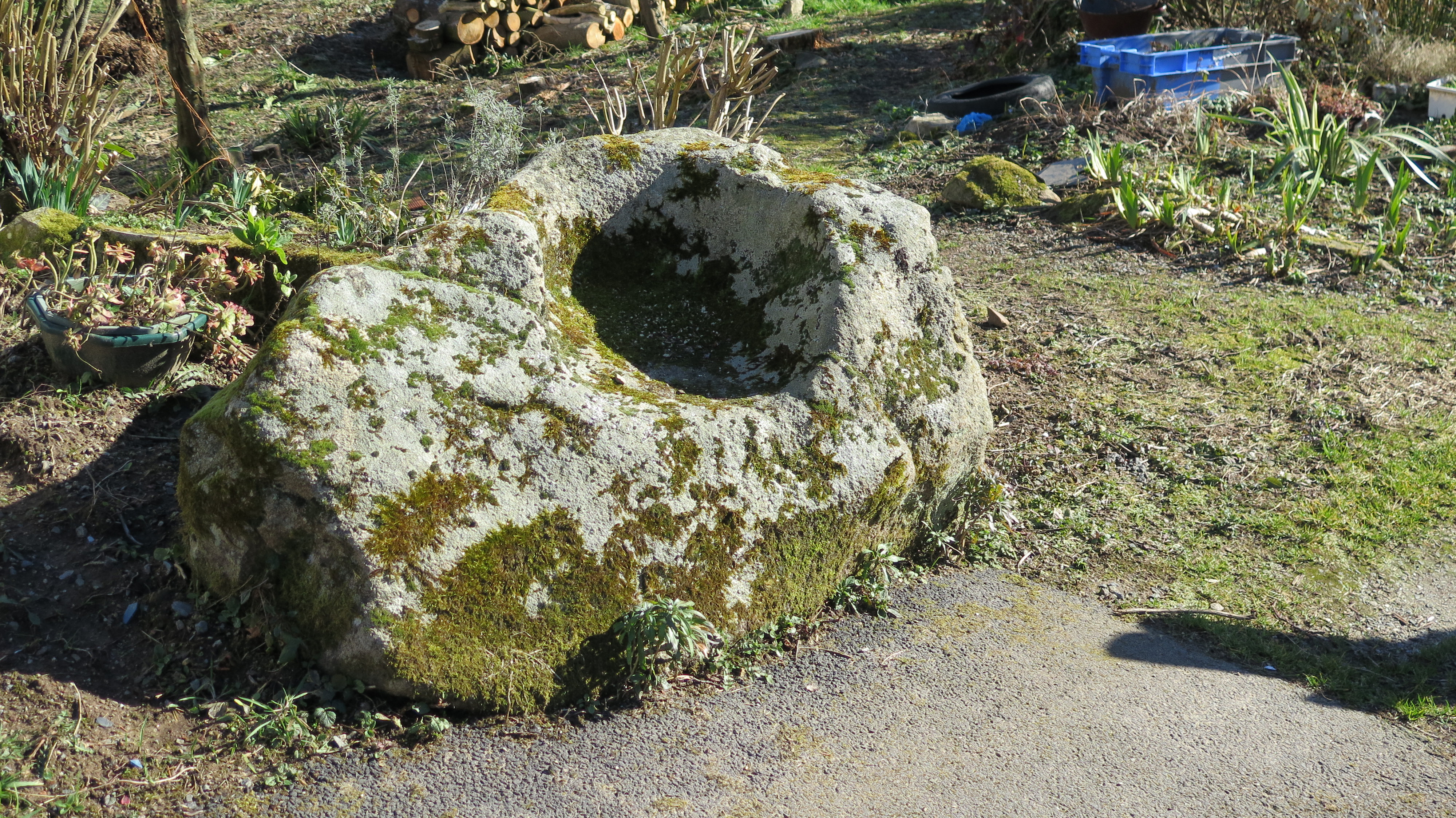 Plufur, Park ar Justice [déplacé dans un jardin] : "chaise de justice" dans un bloc de granite. En breton, "Kador ar barn"Immatriculation