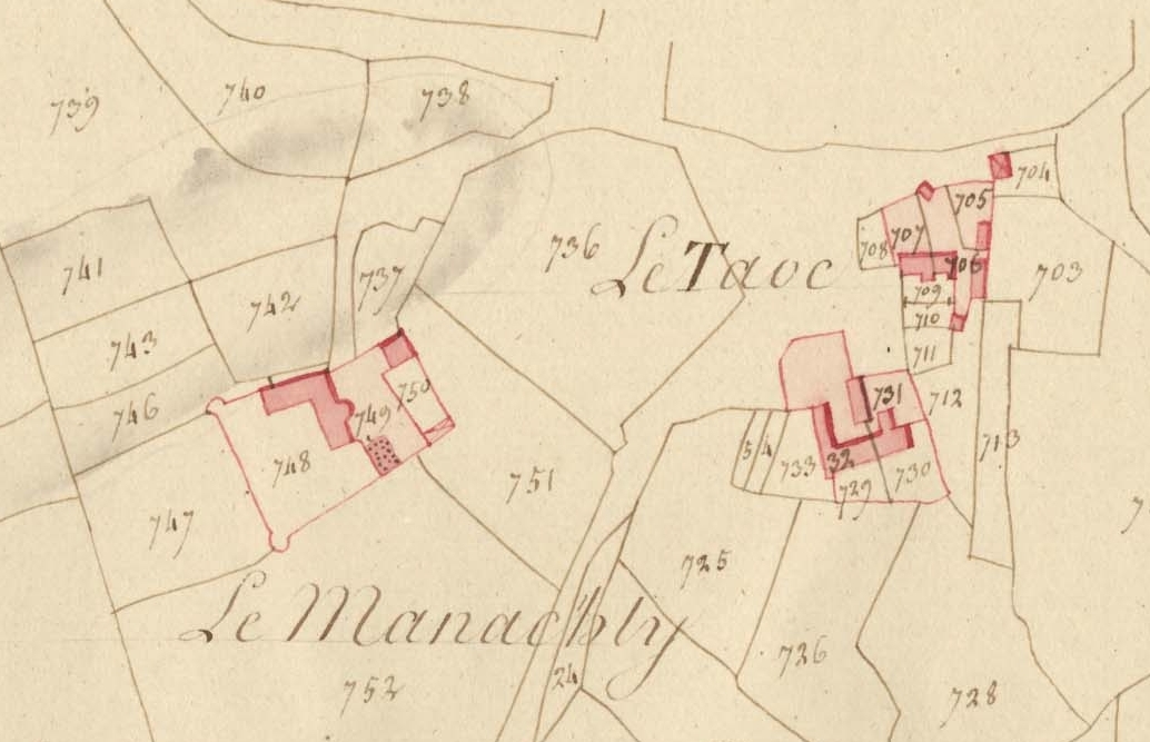 Extrait du cadastre ancien de la commune de Plufur, 1816 : Section D du Manach'Ty, seconde feuille, Le Manac'hty ; Le TaocImmatriculation