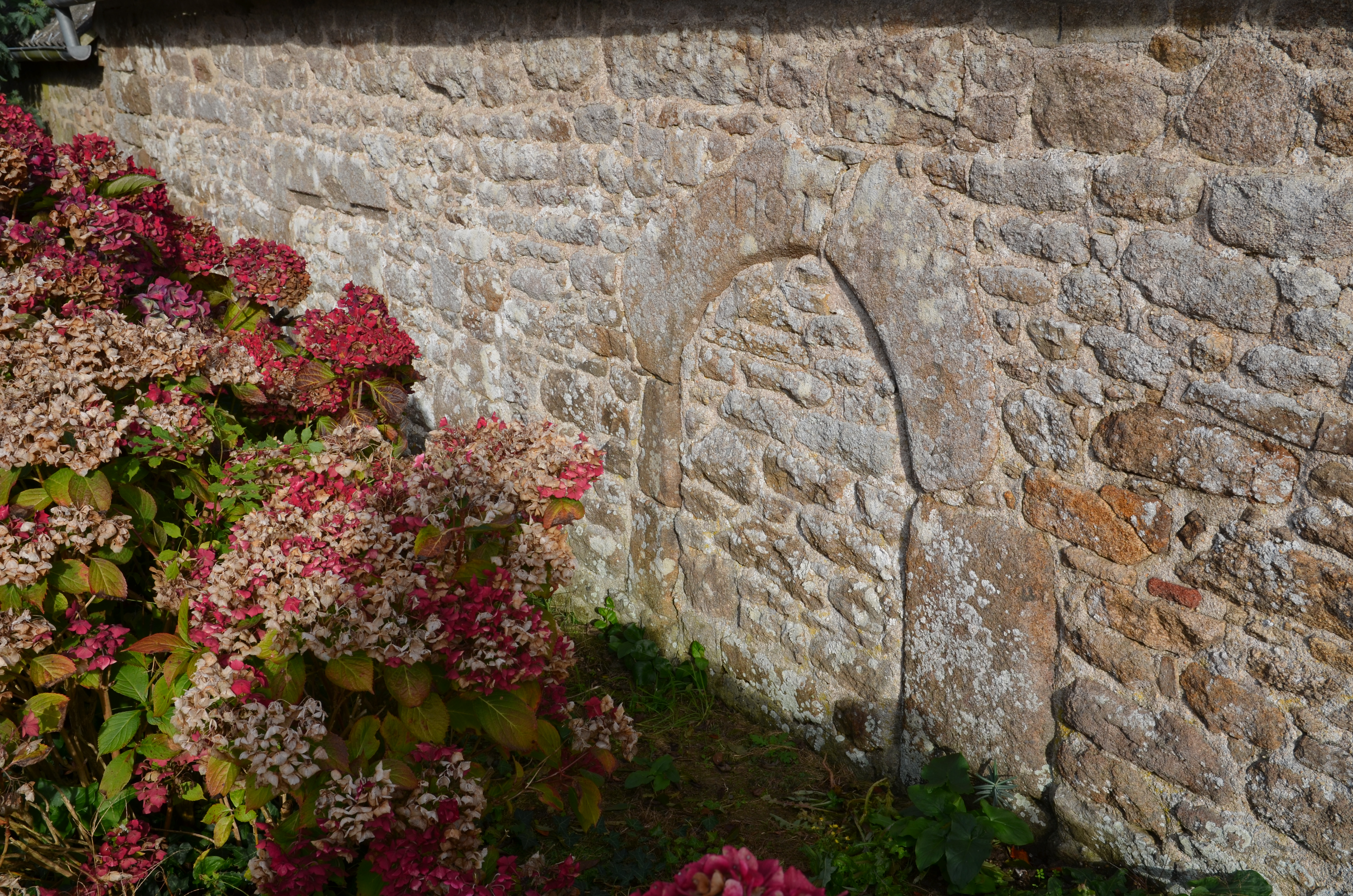 Plufur, Keramono Braz : alignement de trois logis de ferme, logis central, détail des ouvertures ouest (porte datée par millésime de 1701 et fenêtre au linteau orné d'une coquille ou conche)Immatriculation