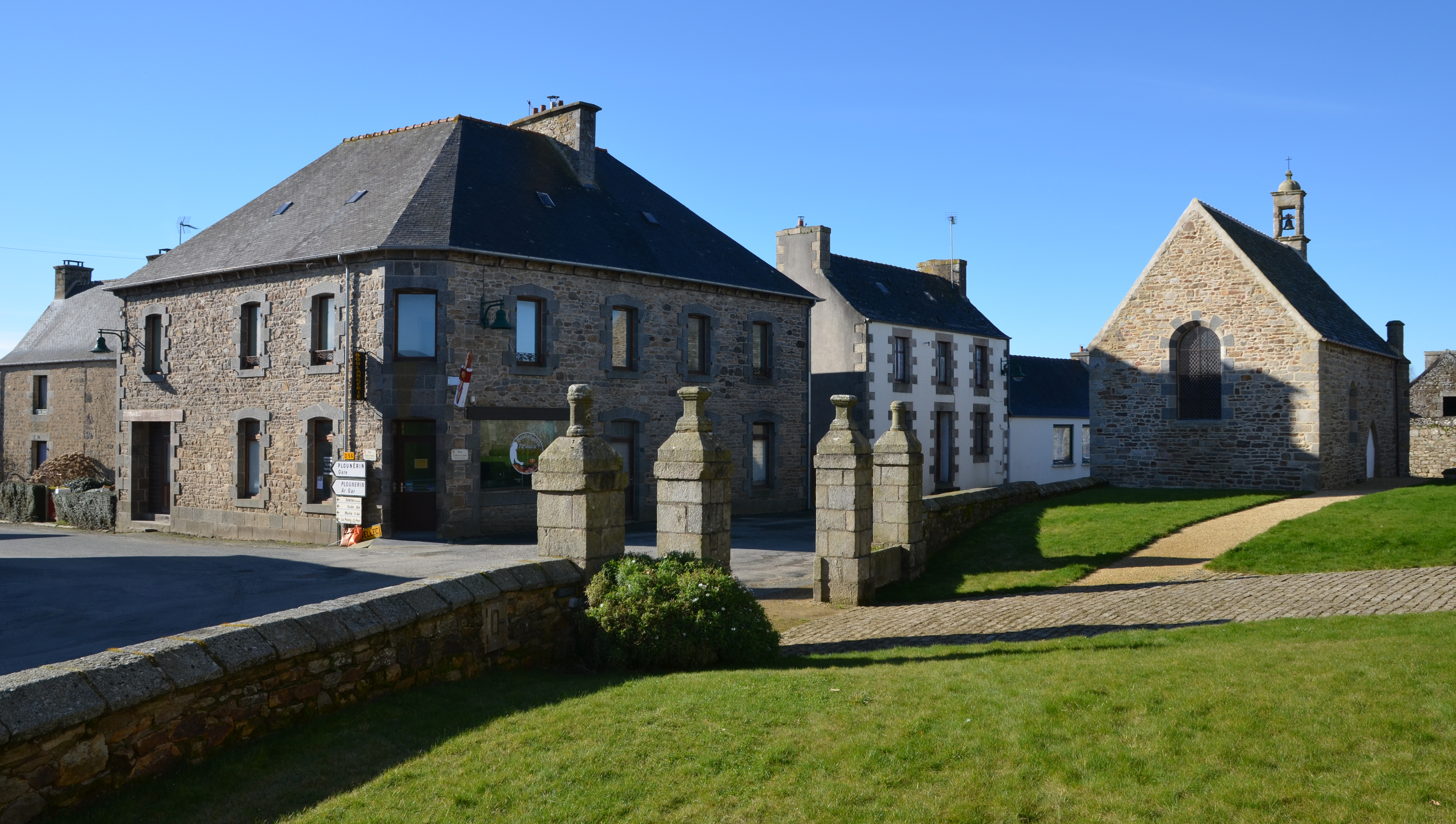 Plufur, place Jean Moulin : magasin de commerce (boulangerie) et chapelle saint Yves, vue générale de la partie sud de la placeImmatriculation
