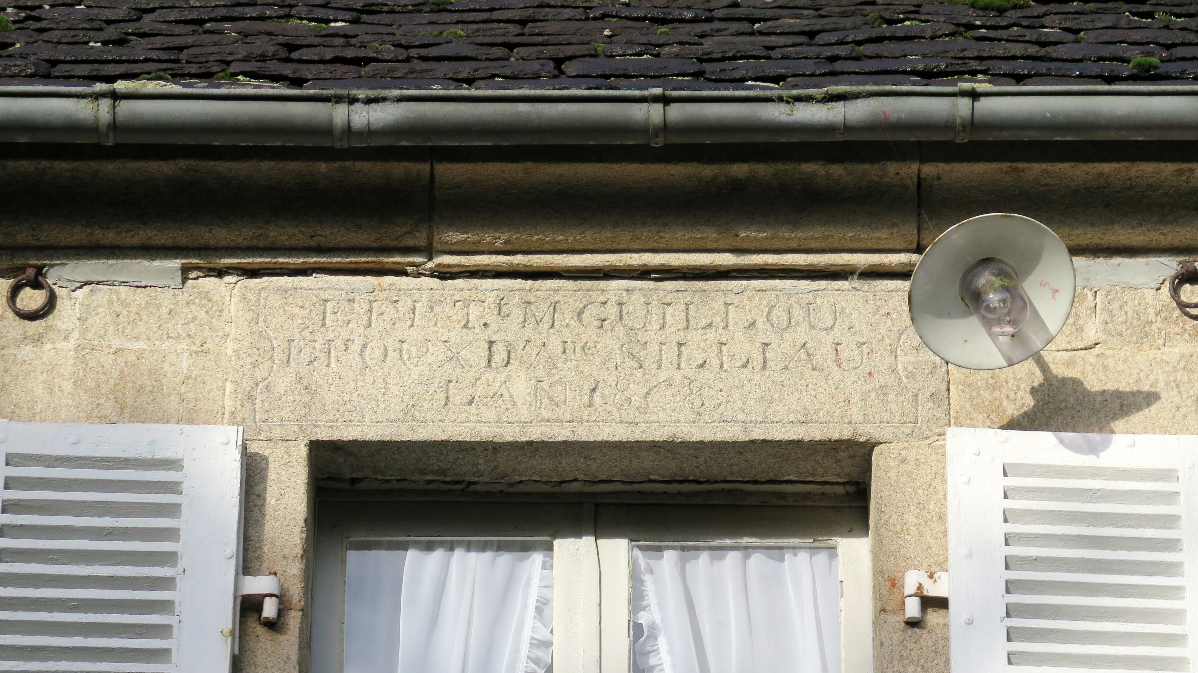 Plufur, Croaz Berr : logis de ferme, élévation antérieure orientée vers le sud-est, détail du linteau de la fenêtre centrale. on peut lire : "F:F:P: T.t M. GUILLOU / EPOUX D'Ane SILLIAU / L'AN 1868"Immatriculation