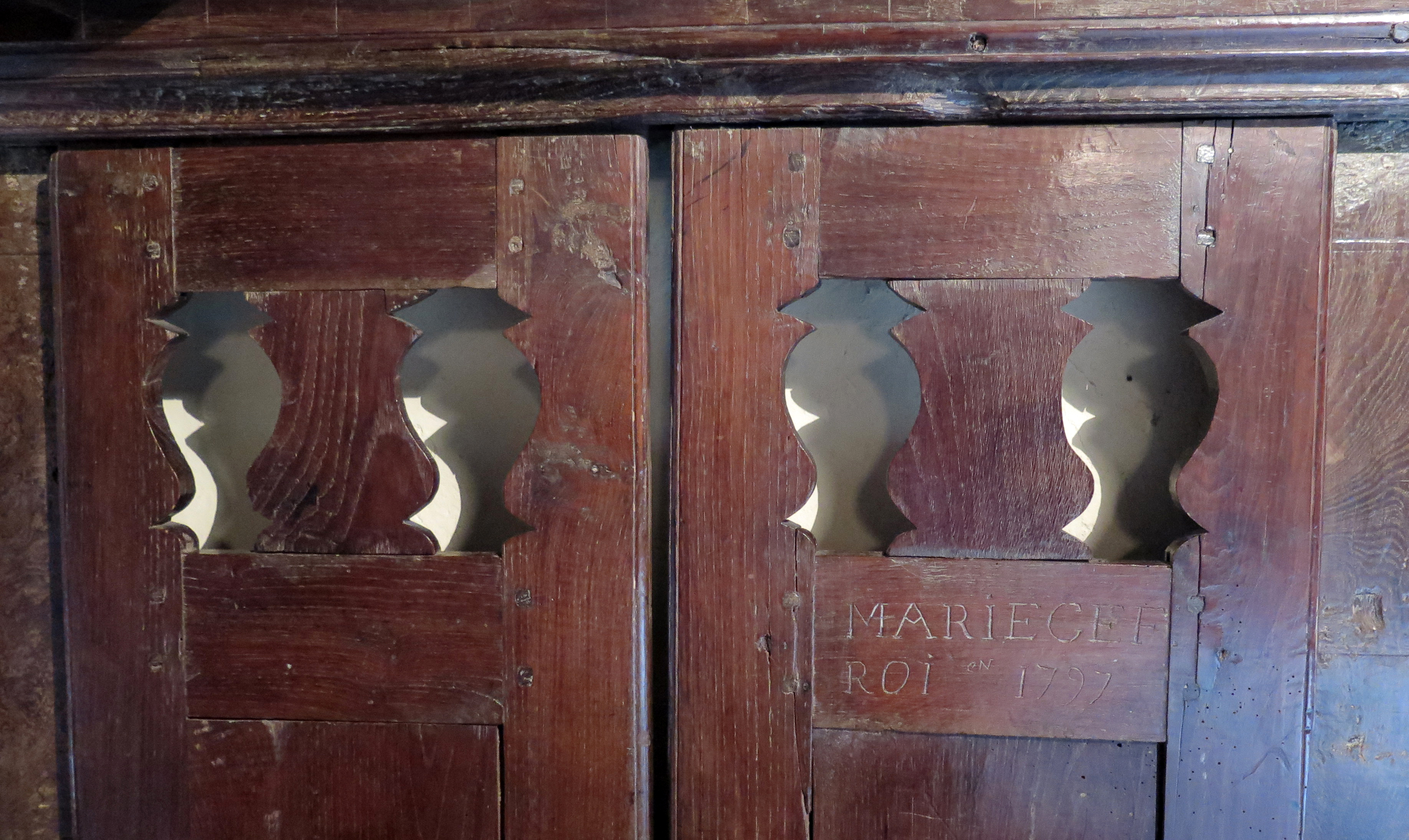 Plufur, Croaz Berr : logis de ferme, rez-de-chaussée, panneau avant de lit-clos. On peut lire : "MARIEGEF / ROI en 1727"Immatriculation