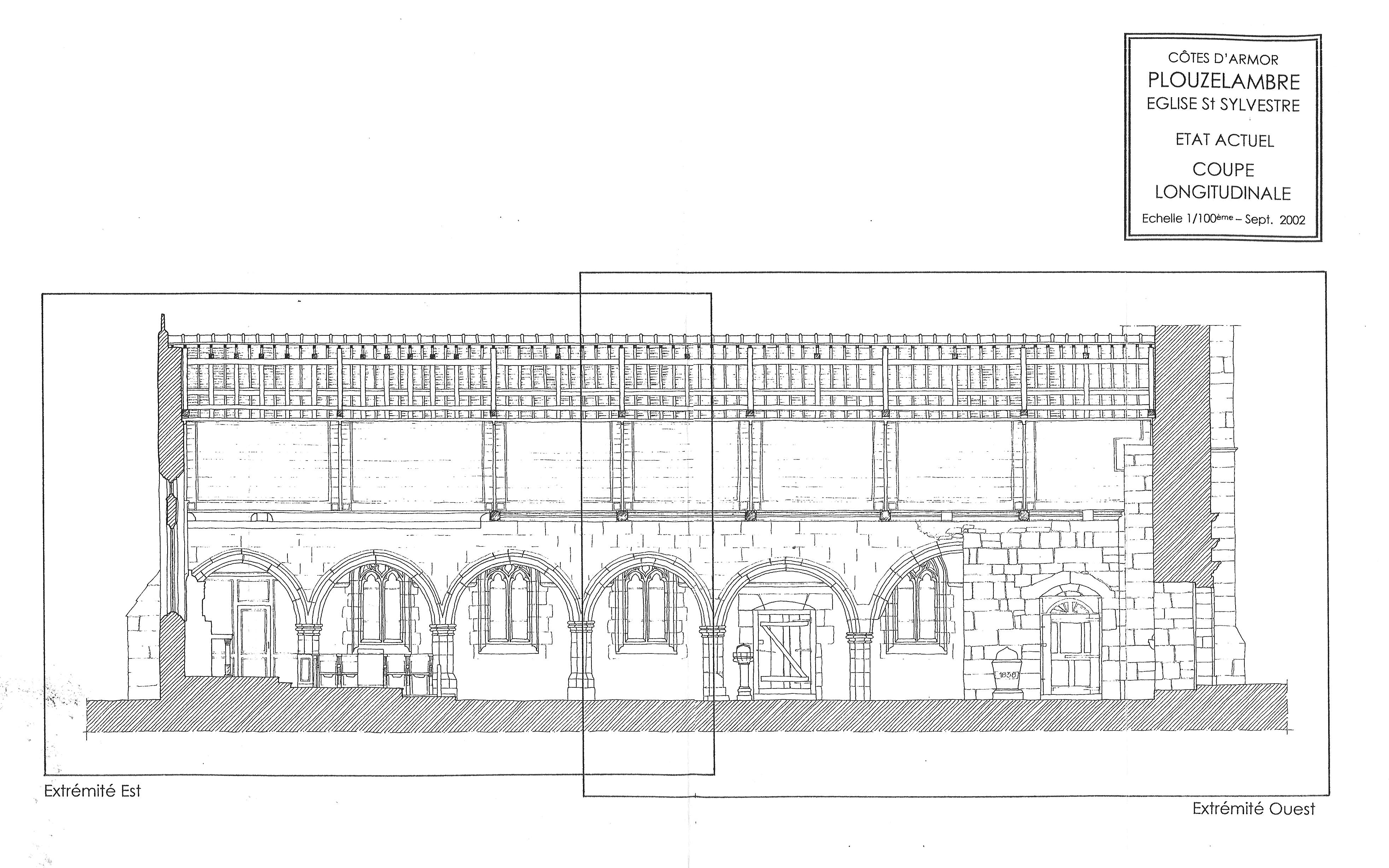 Plouzélambre, le bourg, enclos paroissial : coupe longitudinale de l'église Saint-Sylvestre (extrait de l'étude préalable à la restauration de l'église par Marie-Suzanne DE PONTHAUD, architecte en chef des monuments historiques, septembre 2002)Immatriculation