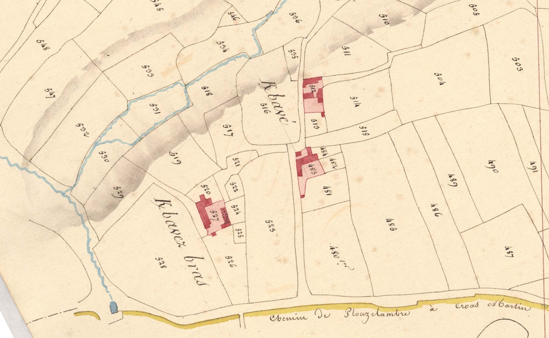 Extrait du cadastre ancien de la commune de Plouzélambre, 1814 : K[er]bavez bras [Kerbavé], K[er]bavéImmatriculation