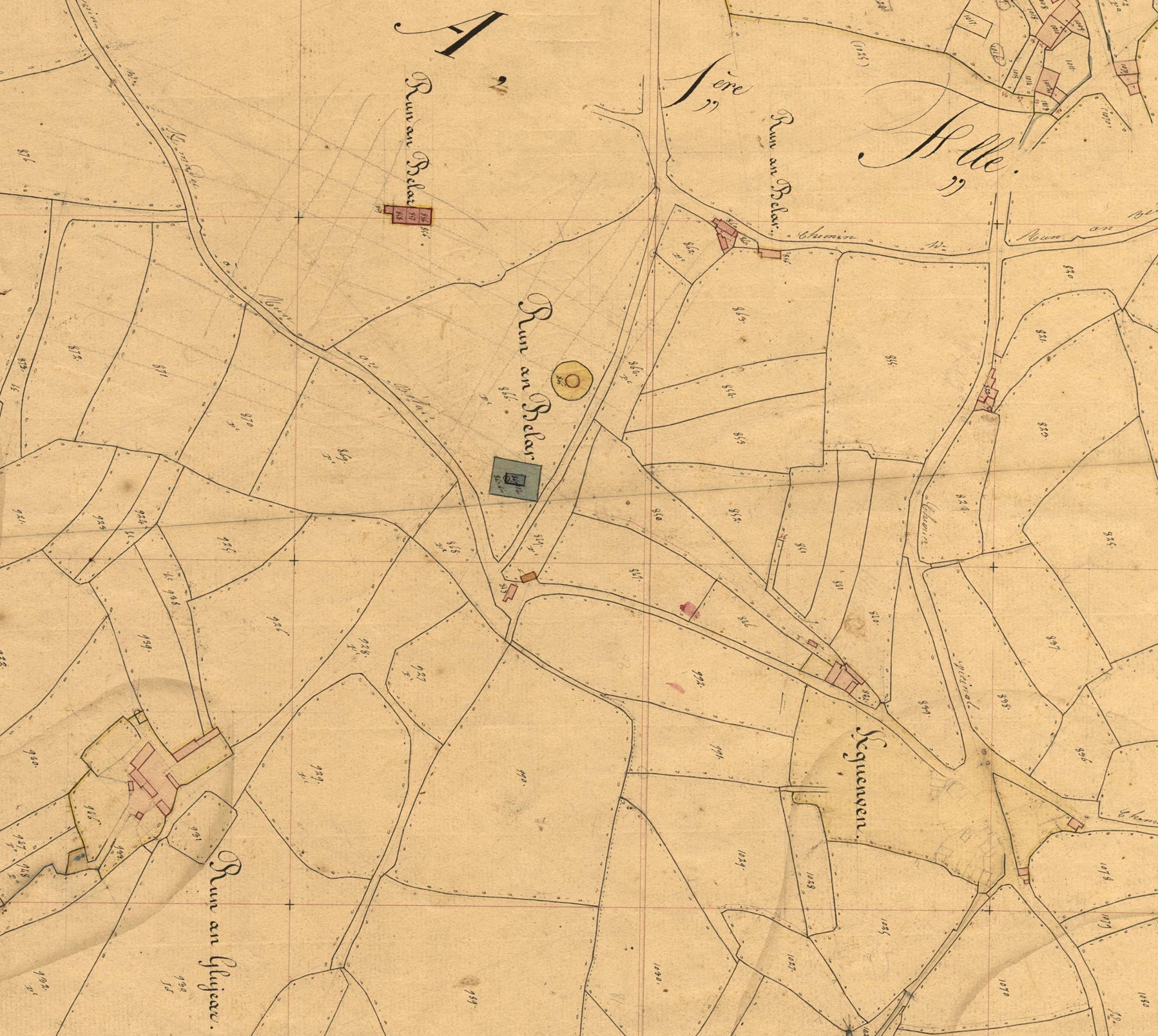 Extrait du cadastre ancien de la commune de Plouzélambre, 1848 : Run an [ar] Belar, chapelle et moulin à ventImmatriculation