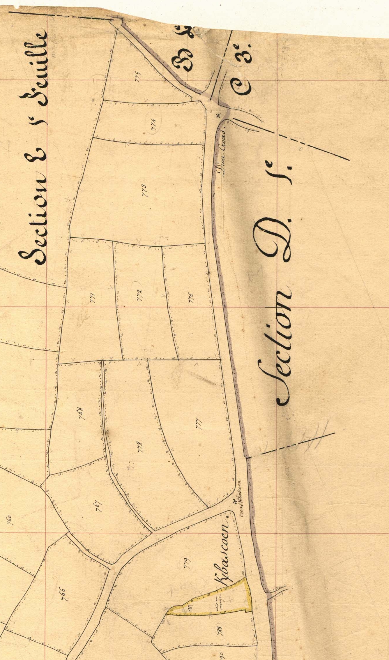 Extrait du cadastre ancien de la commune de Plufur, 1848 : Croas Kerbascoen. Cette croix de chemin, aujourd'hui disparue, était située au sud de Diou CroasImmatriculation