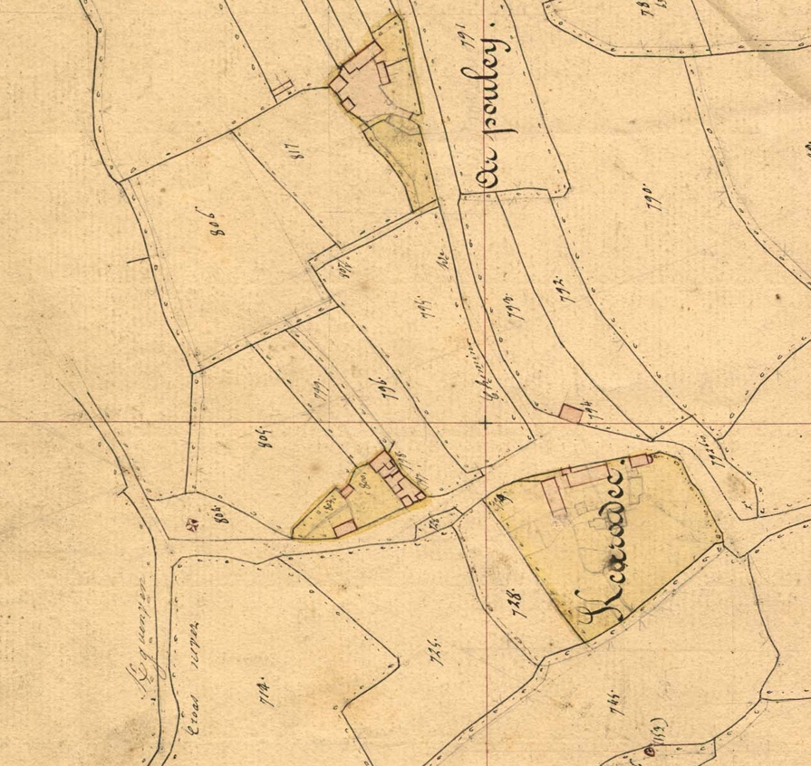 Extrait du cadastre ancien de la commune de Plouzélambre, 1848 : croix de chemin située à l'ouest de KercaradecImmatriculation