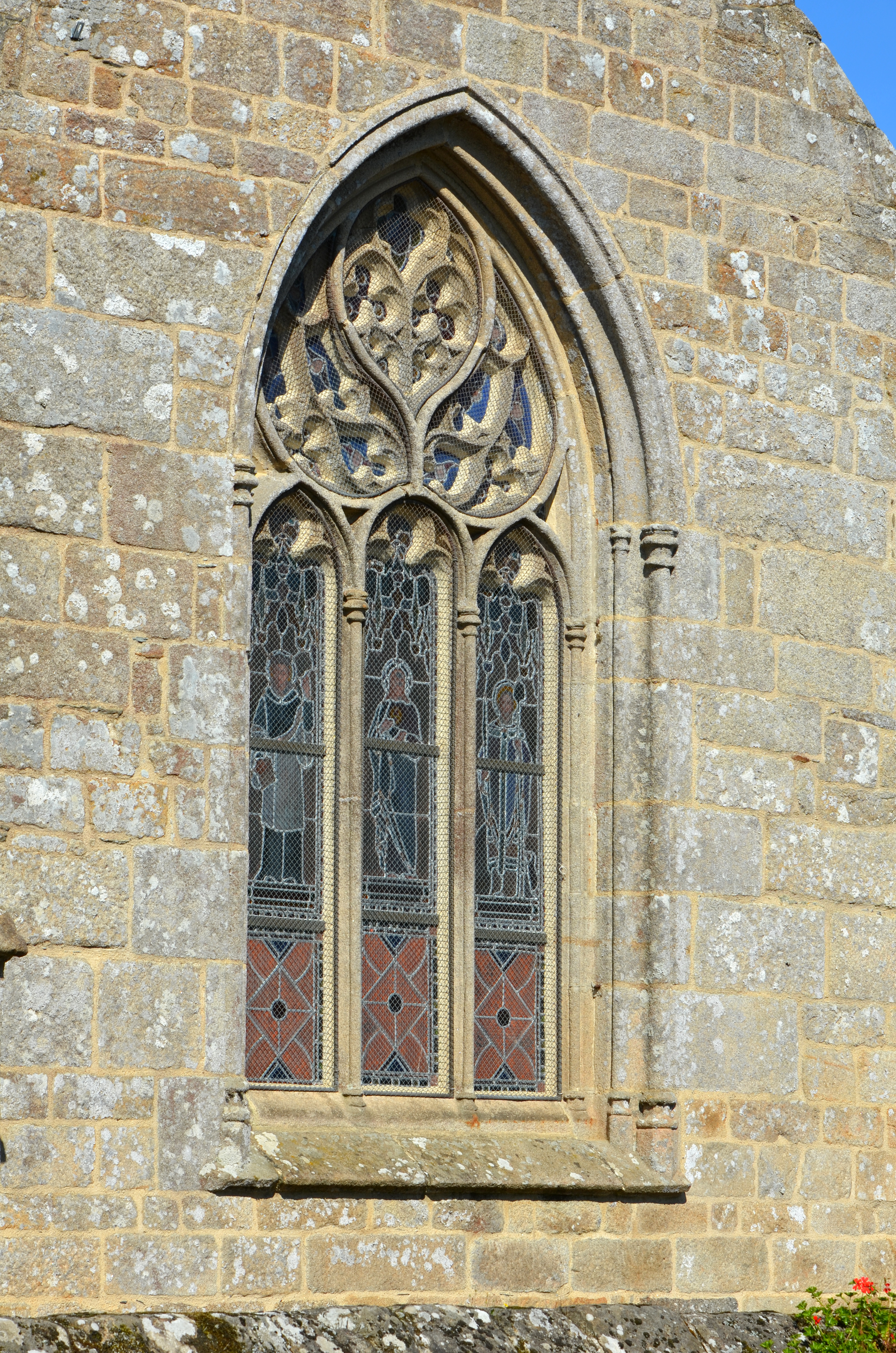 Plouzélambre, le bourg, enclos paroissial : église Saint-Sylvestre, chevet plat percé d'un fenestrage gothique flamboyant (il rappelle celui de l'église de Plouaret datée de 1470-1480)Immatriculation