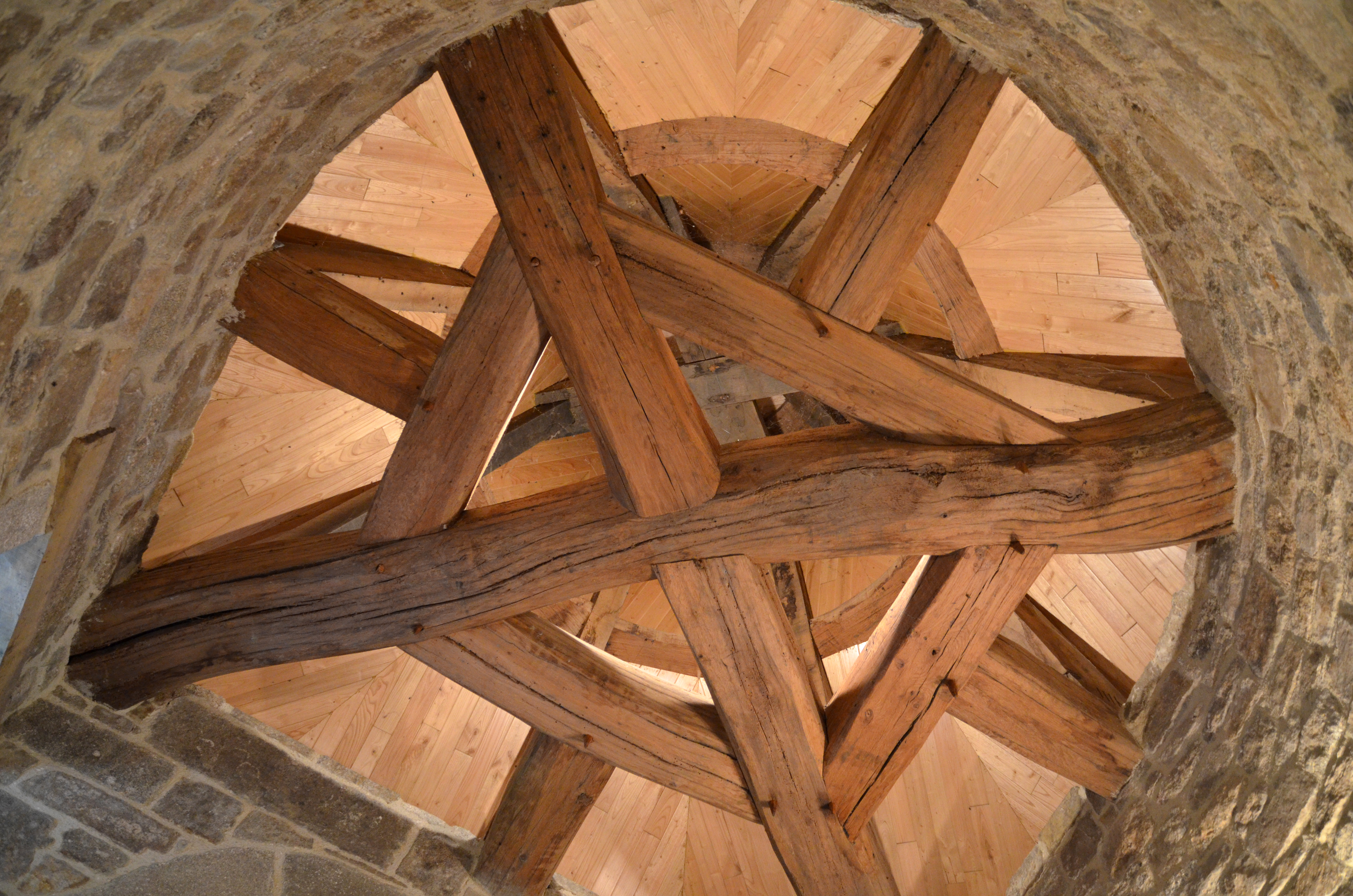 Plouzélambre, Keranboësq : logis datable du 17e siècle, détail de l'enrayure de la charpente de la tour. La tour d'escalier a été créée ex-nihilo dans les années 1980 en s'inspirant de celle du manoir de Kerbest à PlouaretImmatriculation