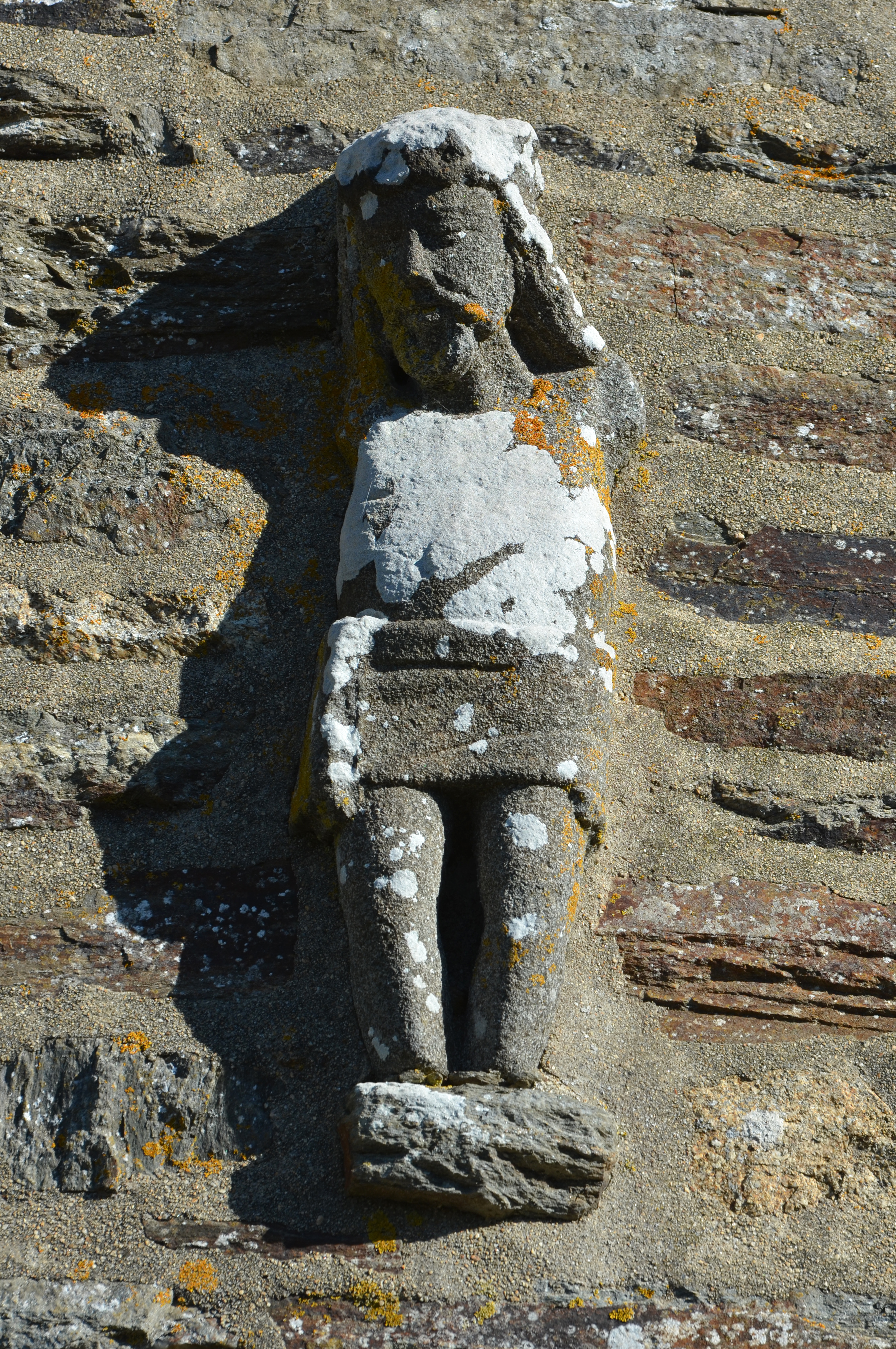 Plouzélambre, carrefour de Garzigou : grand logis daté par millésime de 1867. Il a pour particularité de remployer deux anciennes statues en granite. Ici, un Christ en croixImmatriculation