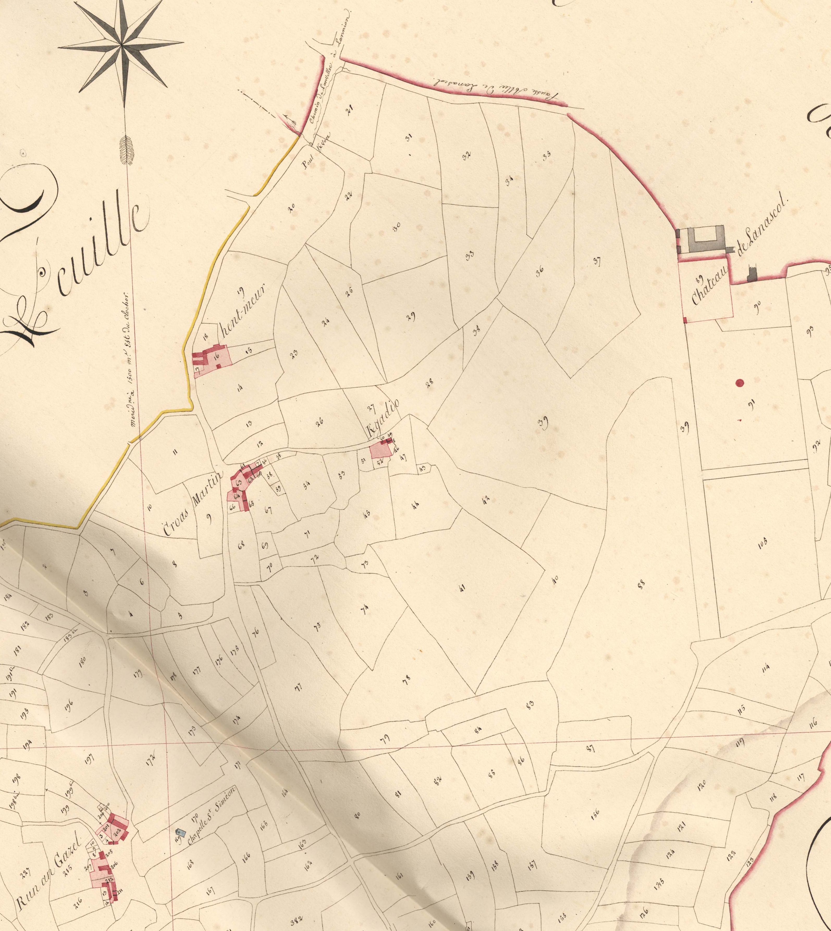 Extrait du cadastre ancien de la commune de Plouzélambre, 1814 : "chemin de Lanvellec à Lannion", Hent Meur, Croas Martin, Kergadio, Run an Gazel et Château de Lanascol (Ploumilliau)Immatriculation