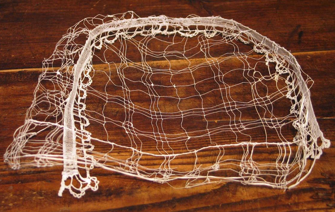 Coiffe du Pays Fanch (Caurel) en filet irrégulier et avec un maillage très important. Collection de Vincent Roussel.Immatriculation